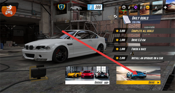 1、在游戏主界面,点击右下角的DRIVE按钮,进入赛道选择环节。