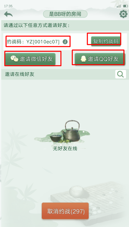 4、如下图约战方式:微信,QQ,或者复制约战码