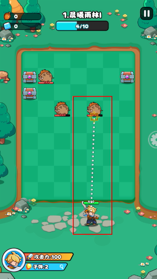 2、战斗初始阶段,角色(攻击力100)在底部区域,上方出现敌方单位,需通过弹射轨迹攻击敌方,累计击败10个单位通关。
