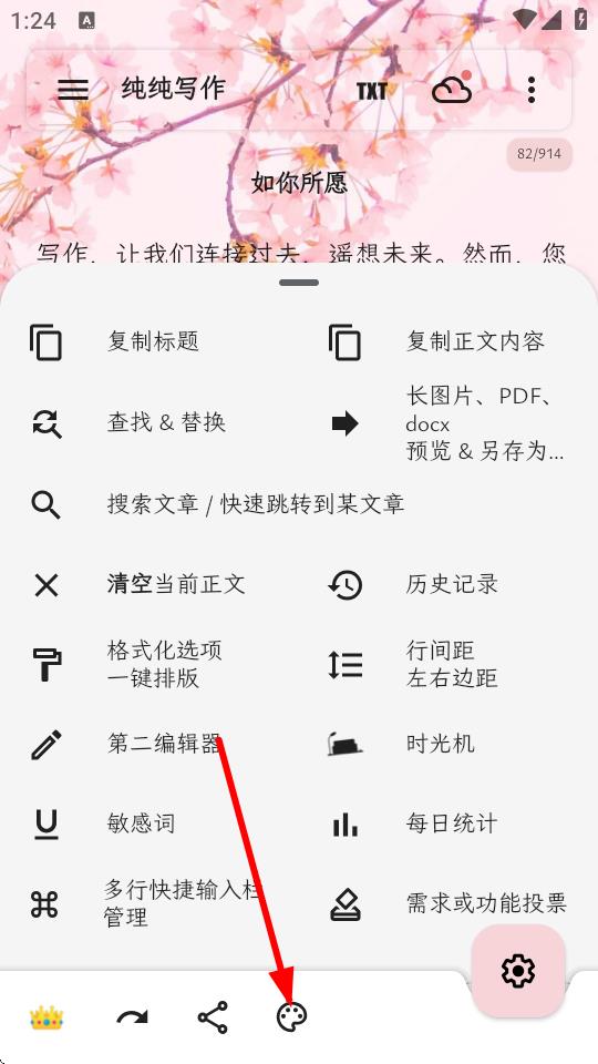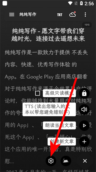 1、在纯纯写作编辑界面,点击右下角+按钮,弹出功能选项菜单。