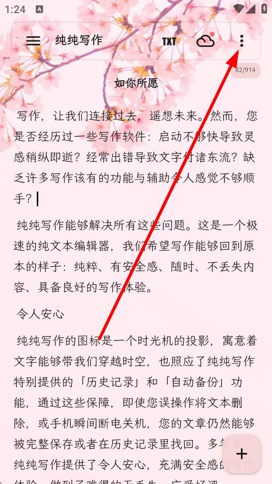 1、打开纯纯写作App进入写作界面,点击右上角三点竖向排列的图标。