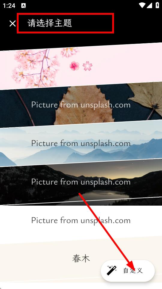 4、若预设主题无法满足需求,还能点击请选择主题界面右下角的自定义按钮,根据喜好自定义背景图片,打造专属写作背景。