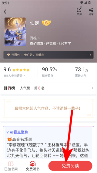 2、在小说详情页面,点击免费阅读选项,进入小说阅读界面。