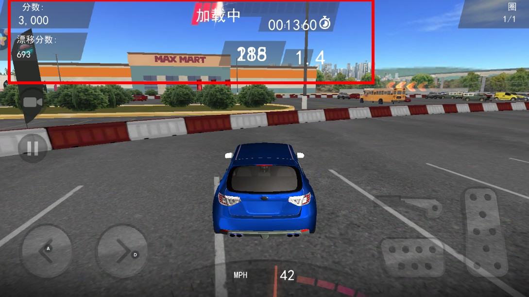 3、在赛道上行驶,可通过漂移等操作获取分数,屏幕上方会显示分数、时间等信息。