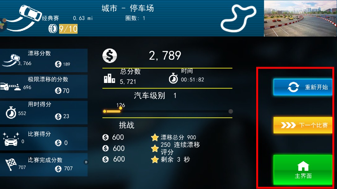 4、比赛结束后,可选择“重新开始”再次挑战,“下一个比赛”进入新赛事,或“主界面”返回游戏主页面。