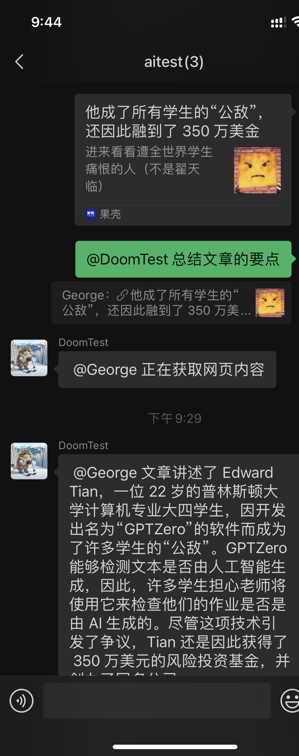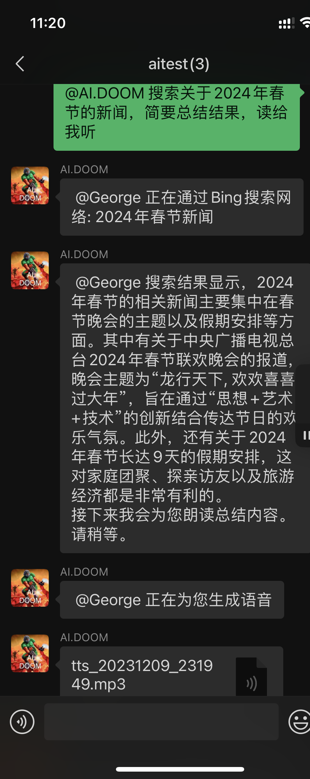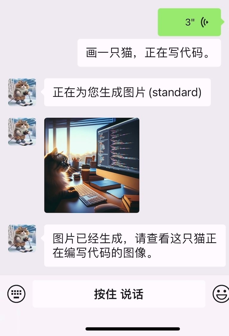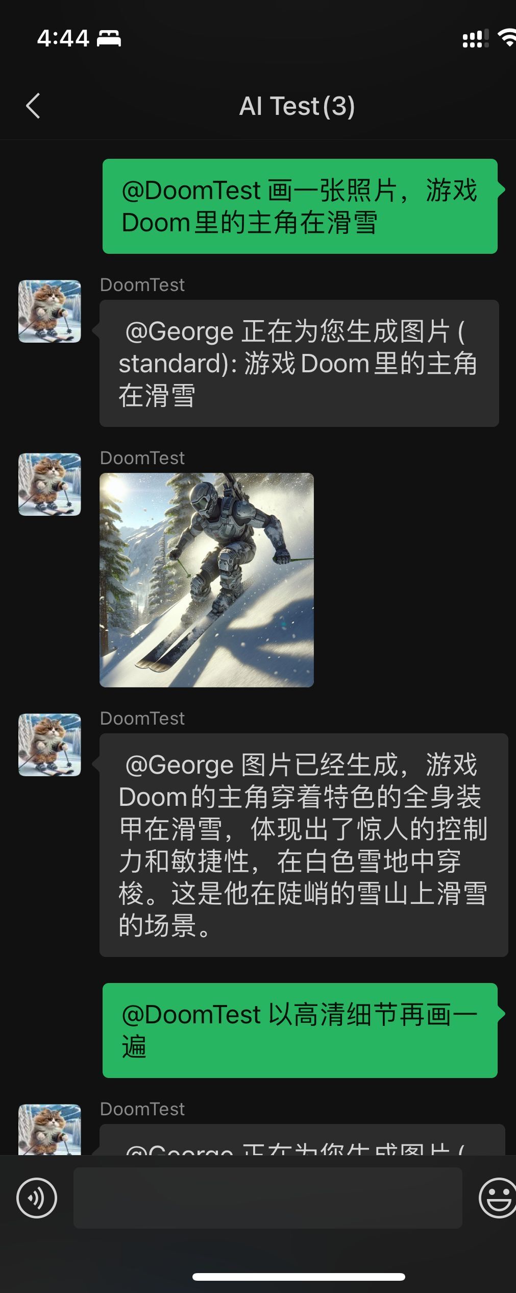 - سيقوم مساعد WeChat AI بتحديد الأداة بشكل مستقل واتصل بها لإكمال المهمة بناءً على نص المستخدم. في الوقت الحاضر ، تشمل الأدوات الرسم (Openai Dall-E-3) ، مترجم رمز ، صوت صناعي (Openai API) ، الوصول إلى صفحات الويب ، البحث ، إلخ.