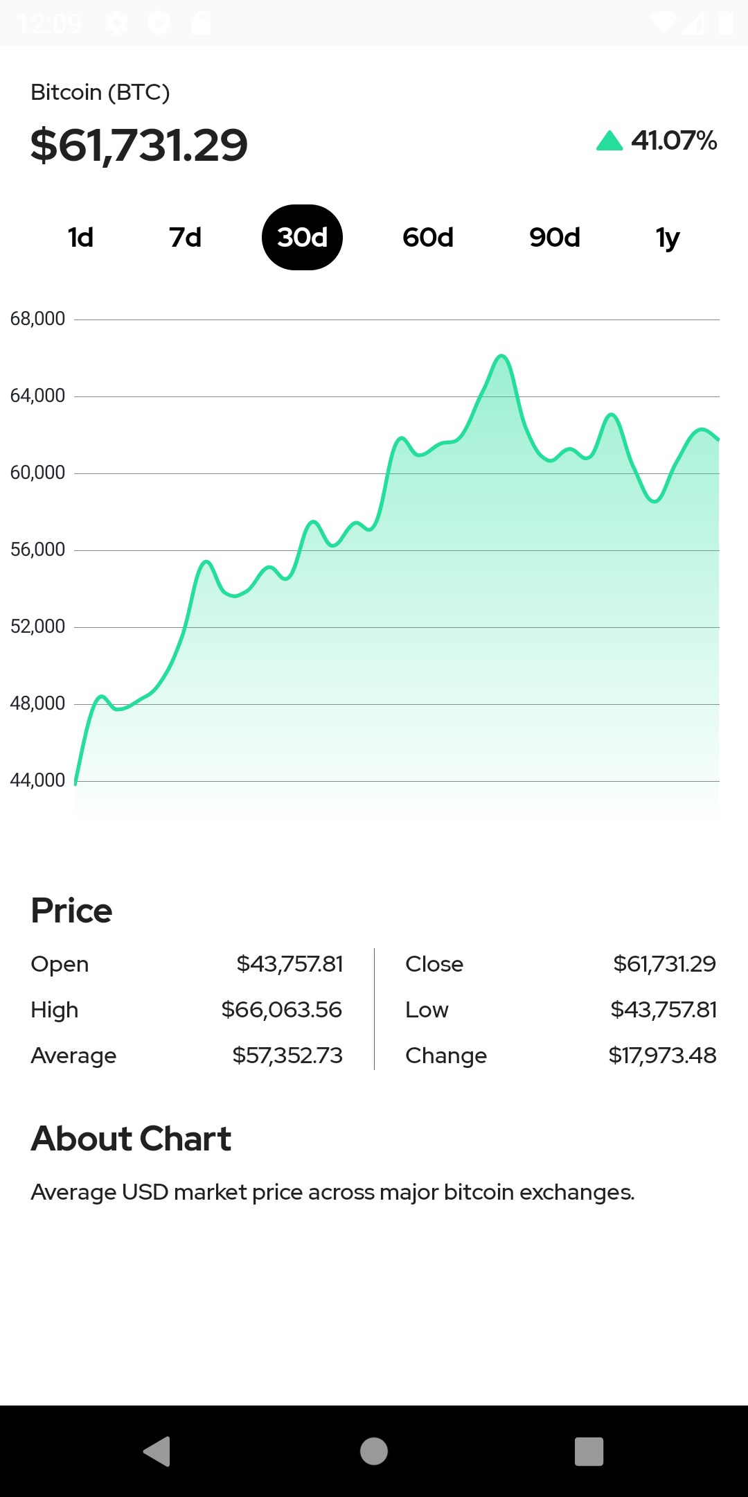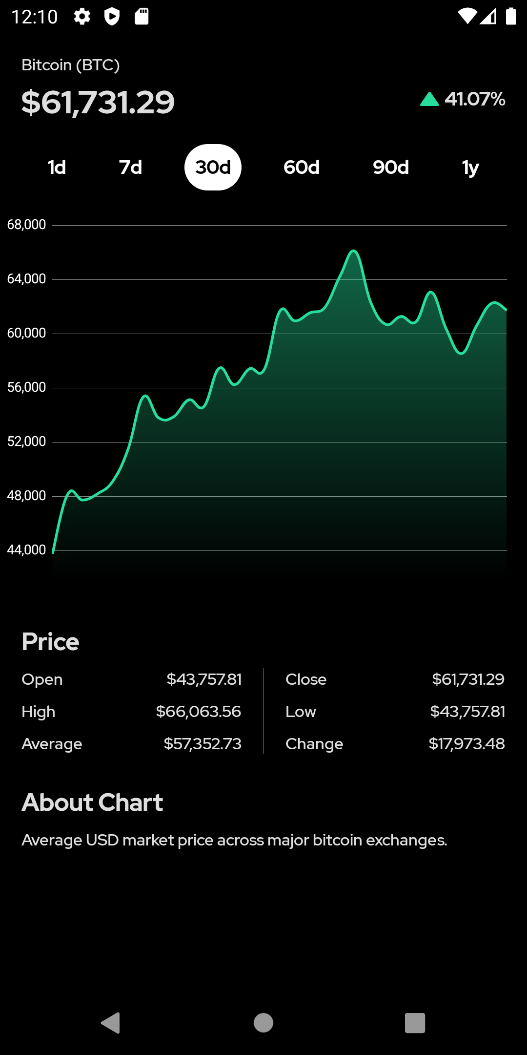 يوضح لك تطبيق Market Bitcoin سعر سوق Bitcoin الحالي ومخطط الأسعار لفترات زمنية مختلفة