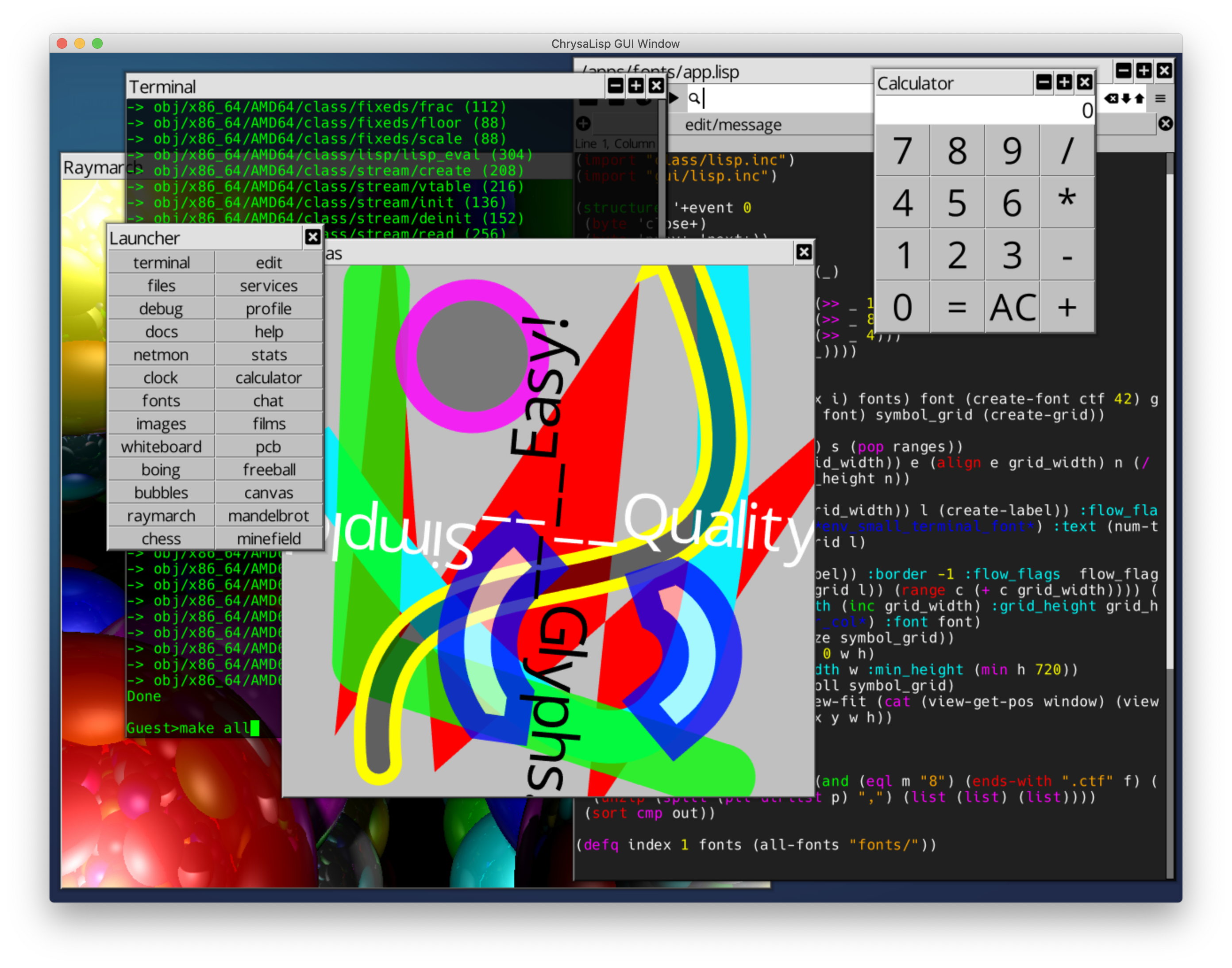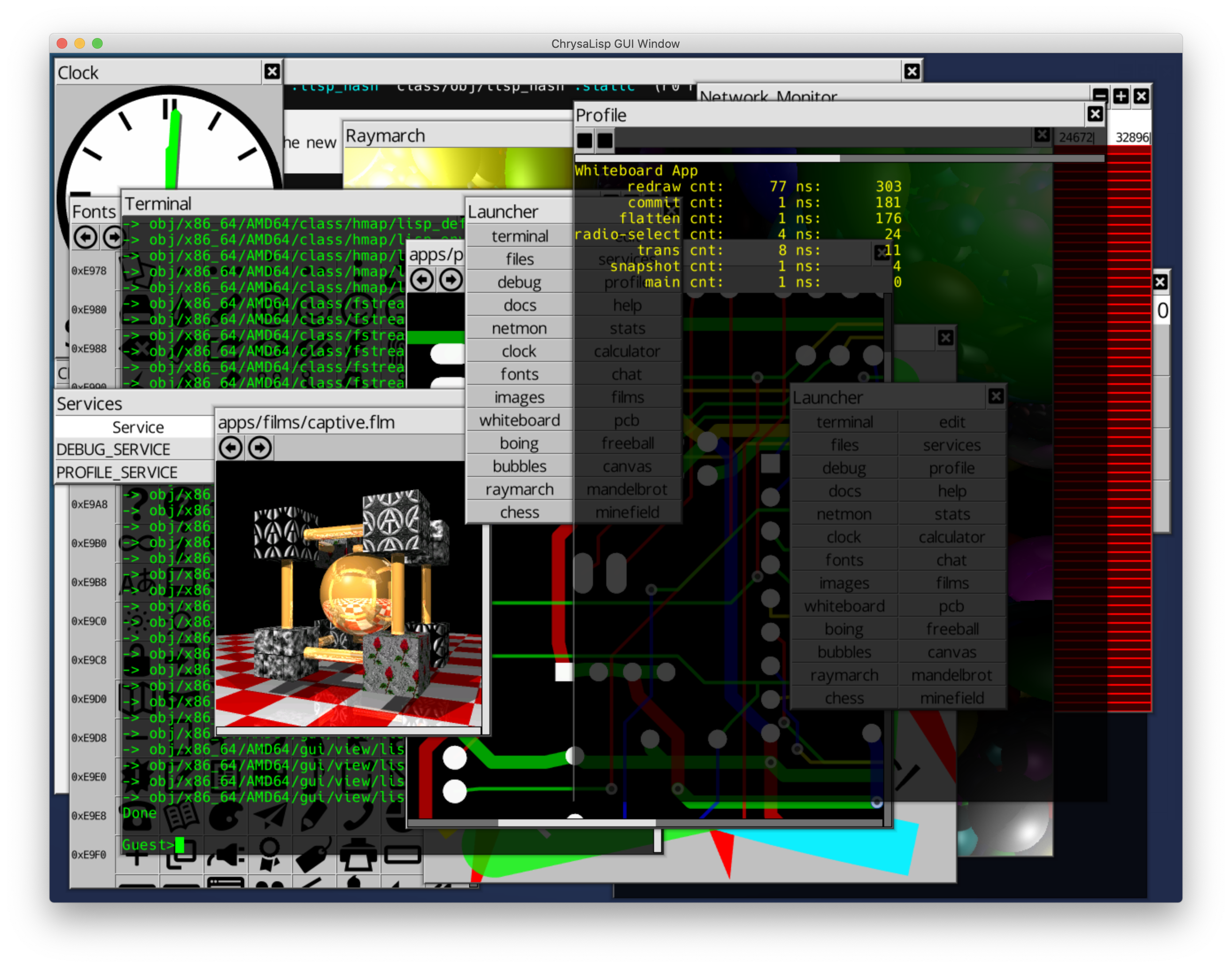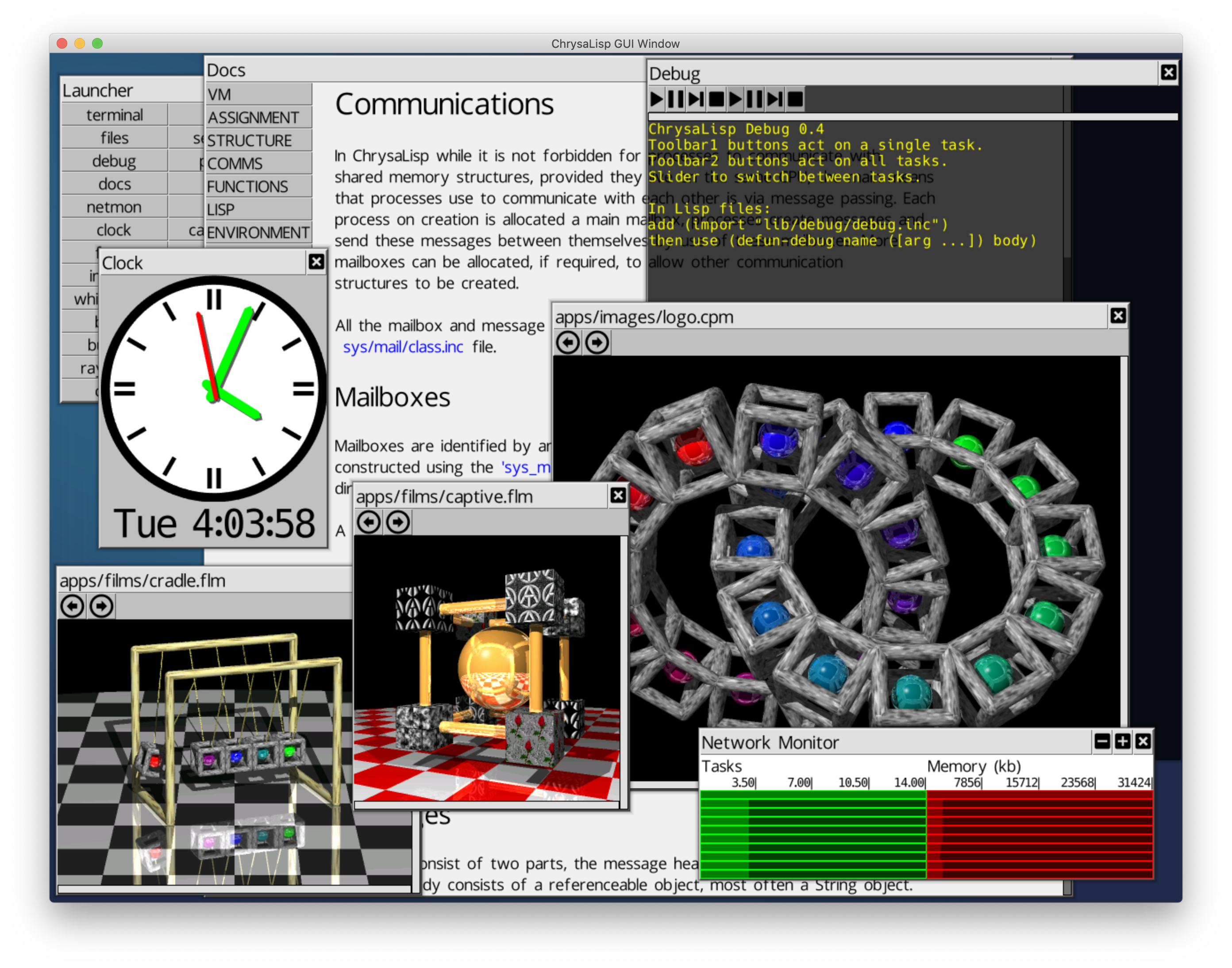 Chrysalisp هو نظام تشغيل موازي 64 بت ، MIMD ، متعدد CPU ، متعدد الخيوط ، متعدد النواة ، متعددة المستخدمين مع ميزات مثل واجهة المستخدم الرسومية ، المحطة ، مجمع OO ، مكتبات الفصل ، مترجم C-script ، مترجم LISP ، مصحح ، PROFILER ، محرك خط المتجه ، وأكثر. وهو يدعم MacOS و Windows و Linux لـ X64 و Riscv64 و ARM64 وسيتحرك في النهاية إلى المعدن العاري. كما يسمح بنمذجة طبولوجيا الشبكة المختلفة واستخدام Chrysalib Hub_nodes للانضمام إلى شبكات المضيف غير المتجانسة. يحتوي على مجموعة تعليمات لوحدة المعالجة المركزية الافتراضية ونظام كائن ونظام فئة قوي للمجمع واللغات عالية المستوى. يحتوي على ربط وتحميل ديناميكي على مستوى الوظيفة ومحطة أوامر مع واجهة مألوفة لتطبيقات سطر الأوامر على غرار الأنابيب. يتم توفير مترجم مشترك يشبه LISP.
