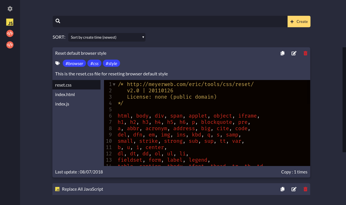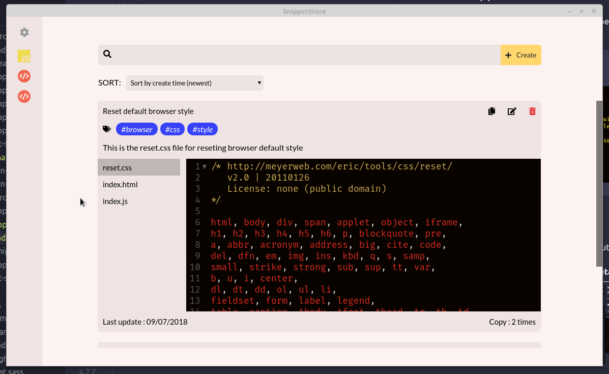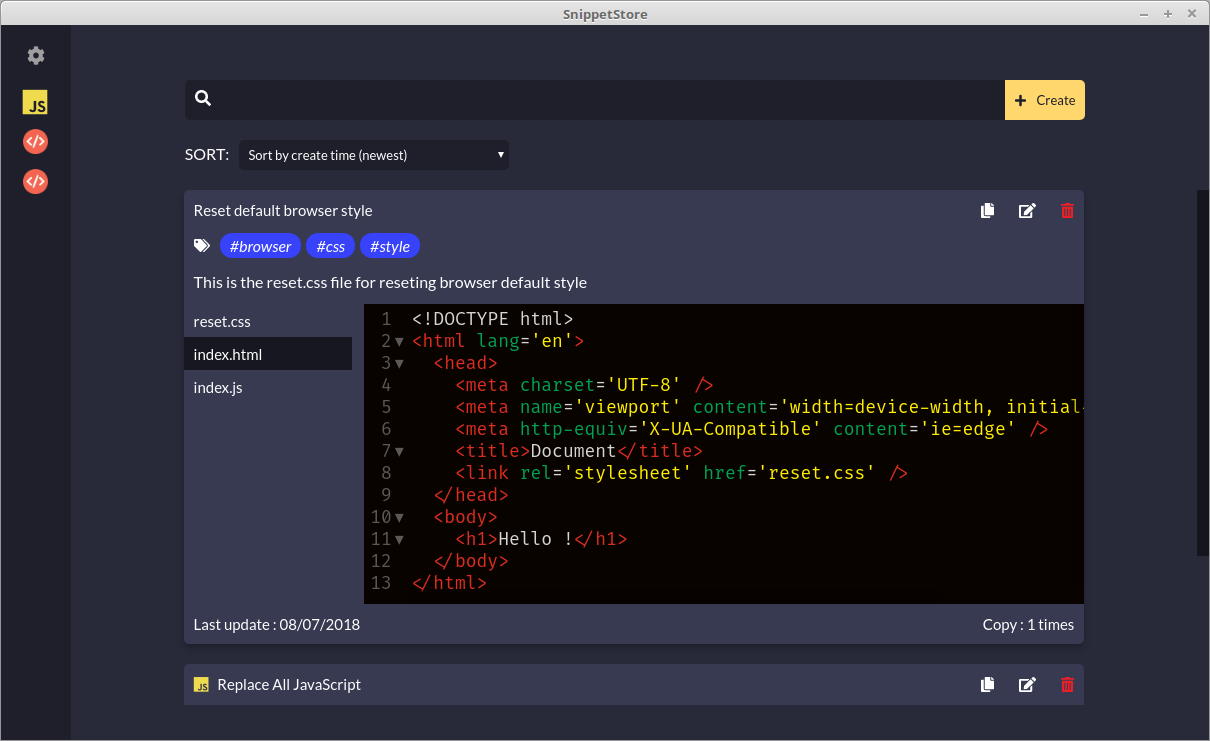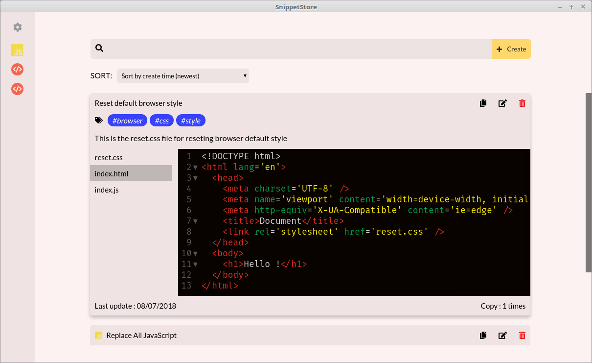 SnippetStore هو تطبيق للمطورين لتخزين قصاصاتهم واستردادها بسرعة عند الحاجة. يركز SnippetStore بشكل أساسي على تخزين التعليمات البرمجية لذلك من الواجهة الصغيرة والبسيطة ، مثالية للمطورين المشغولين الذين لا يهتمون بالتفاصيل الصغيرة.