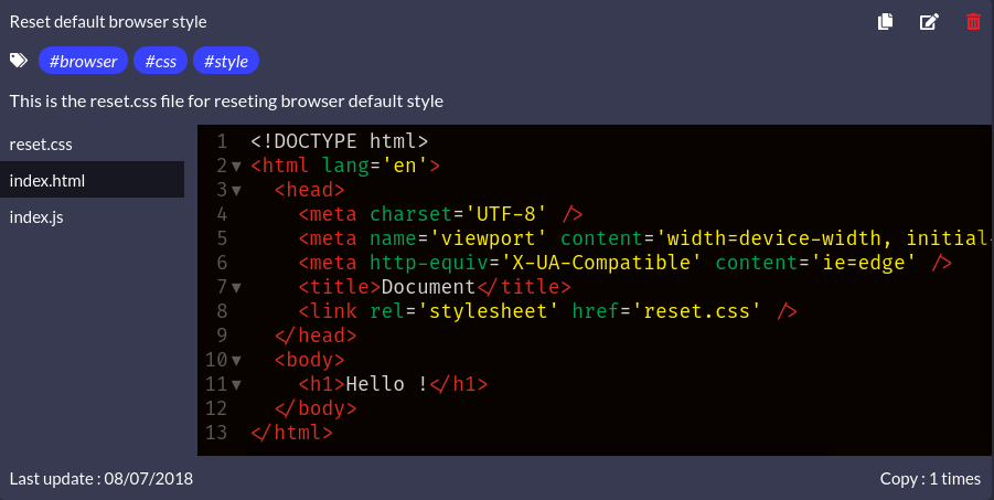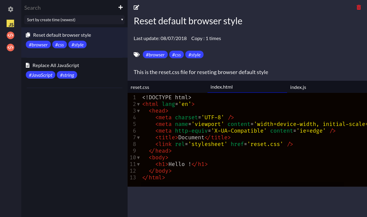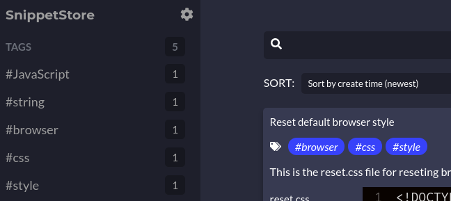 باستخدام SnippetStore ، يمكنك تعيين علامات متعددة إلى المقتطف الخاص بك وسهل العثور عليها باستخدام قائمة العلامات في الشريط الأيمن