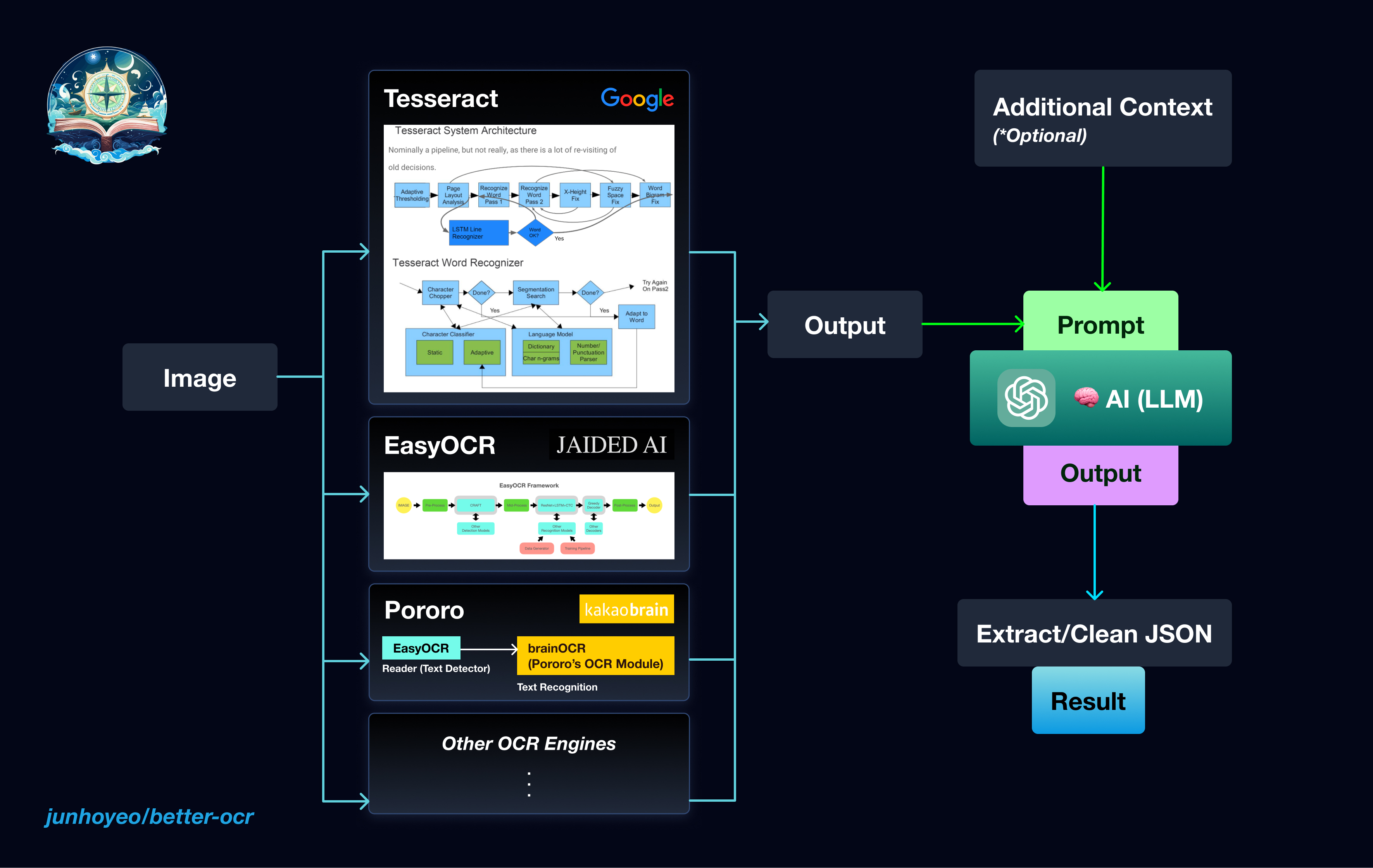 BetteroCh kombiniert Ergebnisse mehrerer OCR -Motoren mit einem LLM, um die Ausgabe zu korrigieren und zu rekonstruieren.