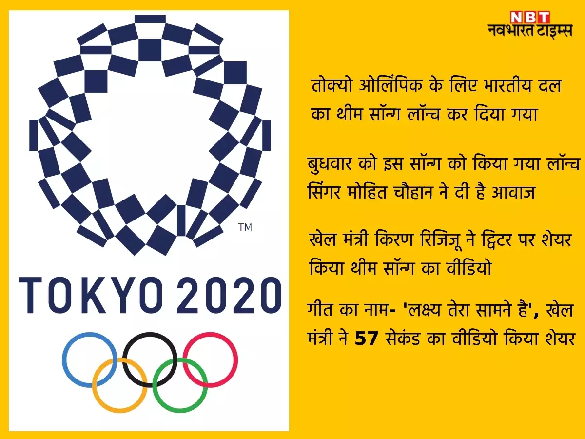 | Ergebnis | नवभारत टाइम्सnतोक्यो ओलिंपिक के लिए भारतीय दल का थीम सॉन्ग लॉन्च कर दिया गयाnबुधवार को इस सॉन्ग को किया गया लॉन्चnसिंगर मोहित चौहान ने दी है आवाजnnखेल मंत्री किरण रिजिजू ने ट्विटर पर शेयर किया थीम सॉन्ग का वीडियोn2020 गीत का नाम- 'लक्ष्य तेरा सामने है', खेल मंत्री ने 57 सेकंड का वीडियो किया शेयर |