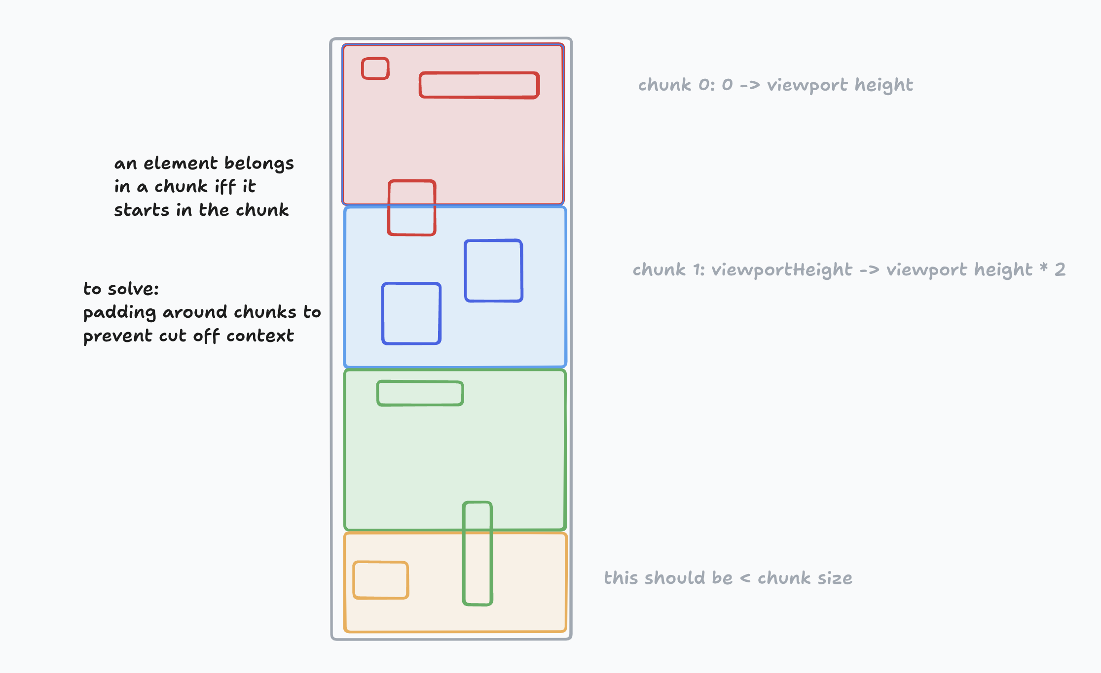 Während LLMs die Kontextfensterlänge weiter erhöhen und die Latenz verringern, sollte es zuverlässiger werden, dass ein Argumentationssystem weniger nachdenkt. Infolgedessen erfolgt die DOM -Verarbeitung in Stücken, um den Kontext pro Inferenzaufruf gering zu halten. Um zu chunkieren, betrachtet der SDK ein Kandidatenelement, das in einem Abschnitt des Ansichtsfensters als Teil dieses Stücks beginnt. In Zukunft wird die Polsterung hinzugefügt, um sicherzustellen, dass ein einzelner Teil nicht den relevanten Kontext fehlt. Sehen Sie dieses Diagramm, wie es aussieht: