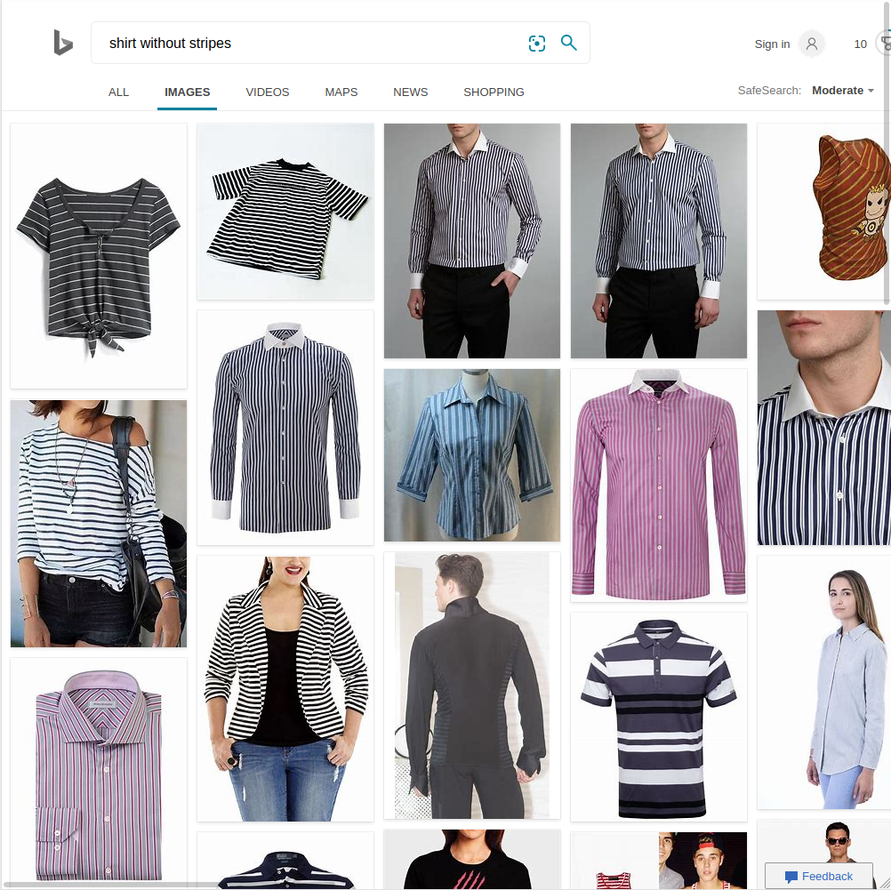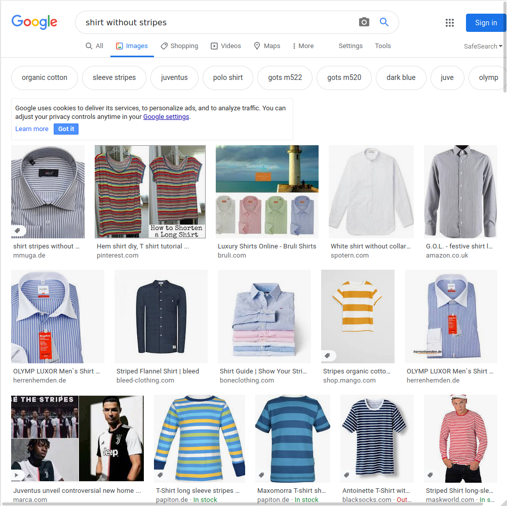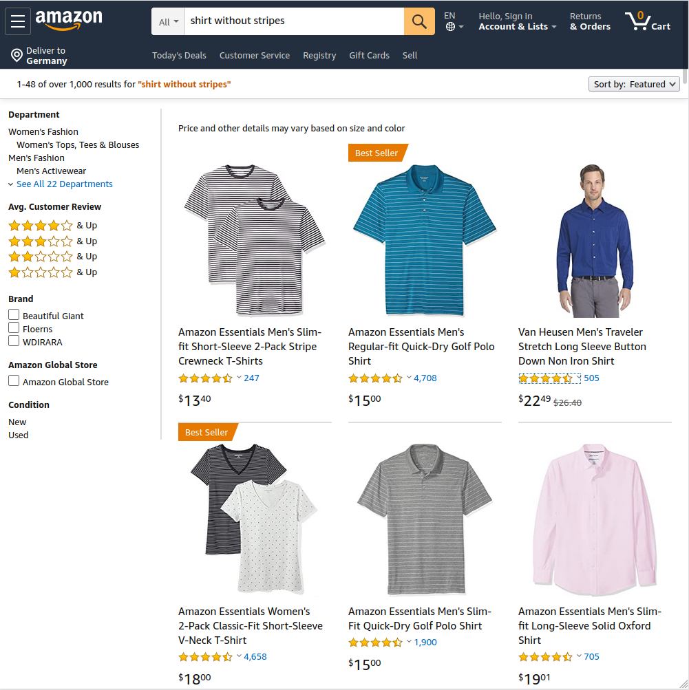 Suchergebnisse für Google, Amazon und Bing, bei der Suche nach "Shirt ohne Streifen".