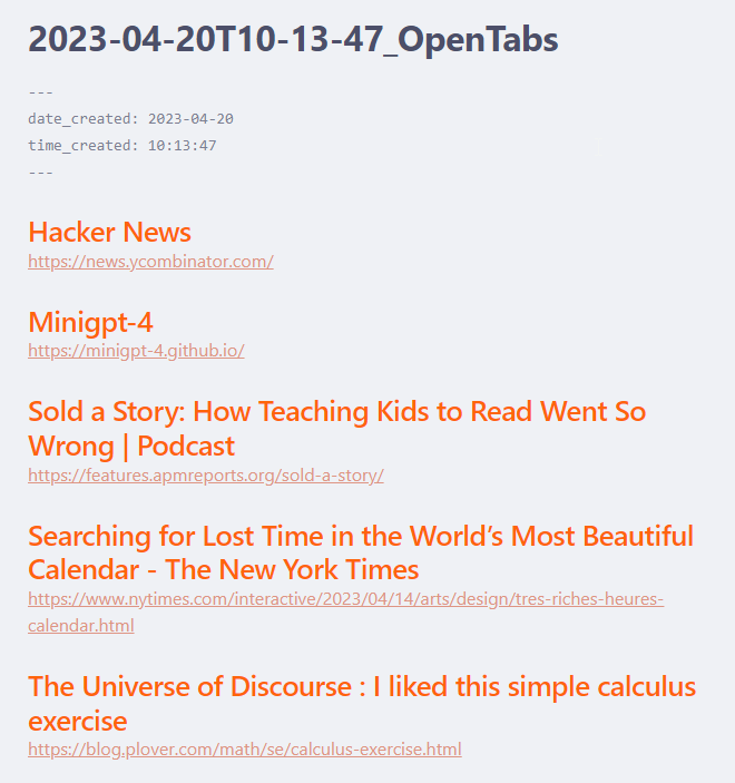 - Die Erweiterung verarbeitet alle offenen Registerkarten (ohne eingeschränkte URLs) und generiert eine Markdown -Datei.