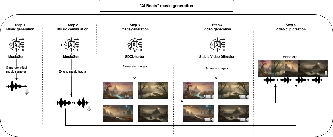 Zunächst verwenden wir ein generatives Modell, um Musikmuster zu erstellen. Nach dem Abschluss des Audio -Teils können wir das Video erstellen. Zuerst beginnen wir mit einem stabilen Diffusionsmodell, um Bilder zu generieren, und dann verwenden wir ein anderes generatives Modell, um ihm ein wenig Bewegung und Animation zu verleihen. Um den endgültigen Videoclip zu komponieren, nehmen wir jede erzeugte Musik und schließen sich mit so vielen animierten Bildern zusammen, um die Länge der Musik zu entsprechen.
