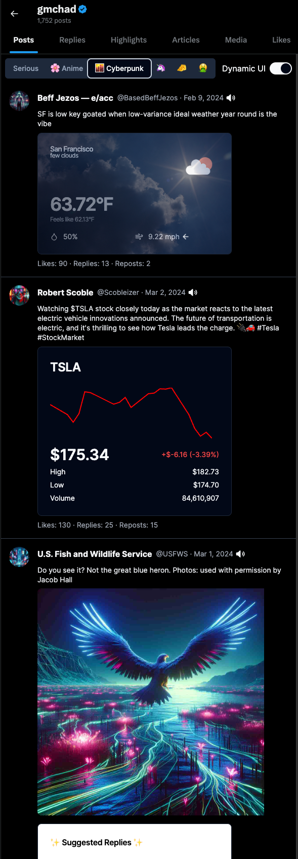 Generative-X (Twitter) erweitert Ihre Twitter-Timeline mit KI mit Bildfiltern, Text-zu-Sprache, automatischen Antworten und dynamischen UI-Komponenten, die sich ansehen, um Tweets mehr Kontext zu geben!