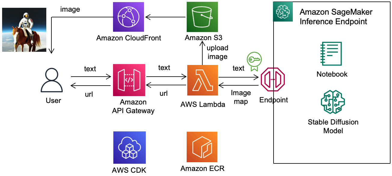 }Die Gesamtarchitektur ist wie folgt. Sagemaker verfügt über ein stabiles Diffusionsmodell, das Jumpstart bereitstellt, um ein Bild aus dem Eingabetxt zu erstellen. Lambda liefert die vom Benutzer gelieferten Textinformationen durch IAM -Authentifizierung an den Sagemaker -Endpunkt und erhält die Informationen des resultierenden Bildes in Form der Bildkarte. Die Bildkarte wird im S3 als JPEG -Format gespeichert, damit der Benutzer sie problemlos verwenden kann und eine URL für das Bild mithilfe von CloudFront -Domäneninformationen erstellt. Das API -Gateway empfängt die Anfrage des Benutzers als erholsame API und liefert die Anfrage des Benutzers an die Lambda, und die von Lambda erstellten URL -Bildinformationen werden dem Benutzer übermittelt. Alle Dienste werden mit AWS CDK verteilt und Docker -Containerbilder werden mit ECR verwaltet.