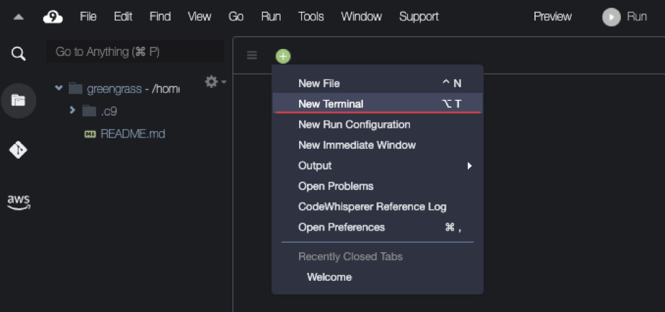 Wählen Sie nach dem Erstellen von Cloud9 [Öffnen] und geben Sie das Terminal wie unten gezeigt ein.