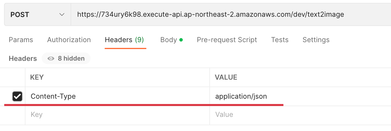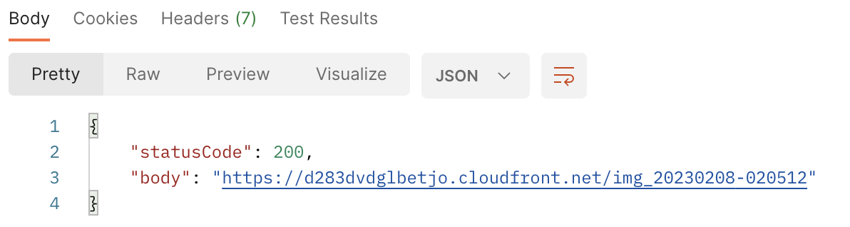 { "statusCode" : 200 , "body" : "https://d283dvdglbetjo.cloudfront.net/img_20230208-014926" }Wählen Sie die nachstehend gezeigte Post -Methode aus und geben Sie die URL ein.