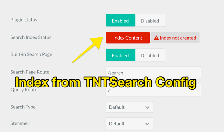 Alternativ können Sie zum Abschnitt "TNTSEARCH -Konfiguration" navigieren und auf die Schaltfläche Index Content klicken: