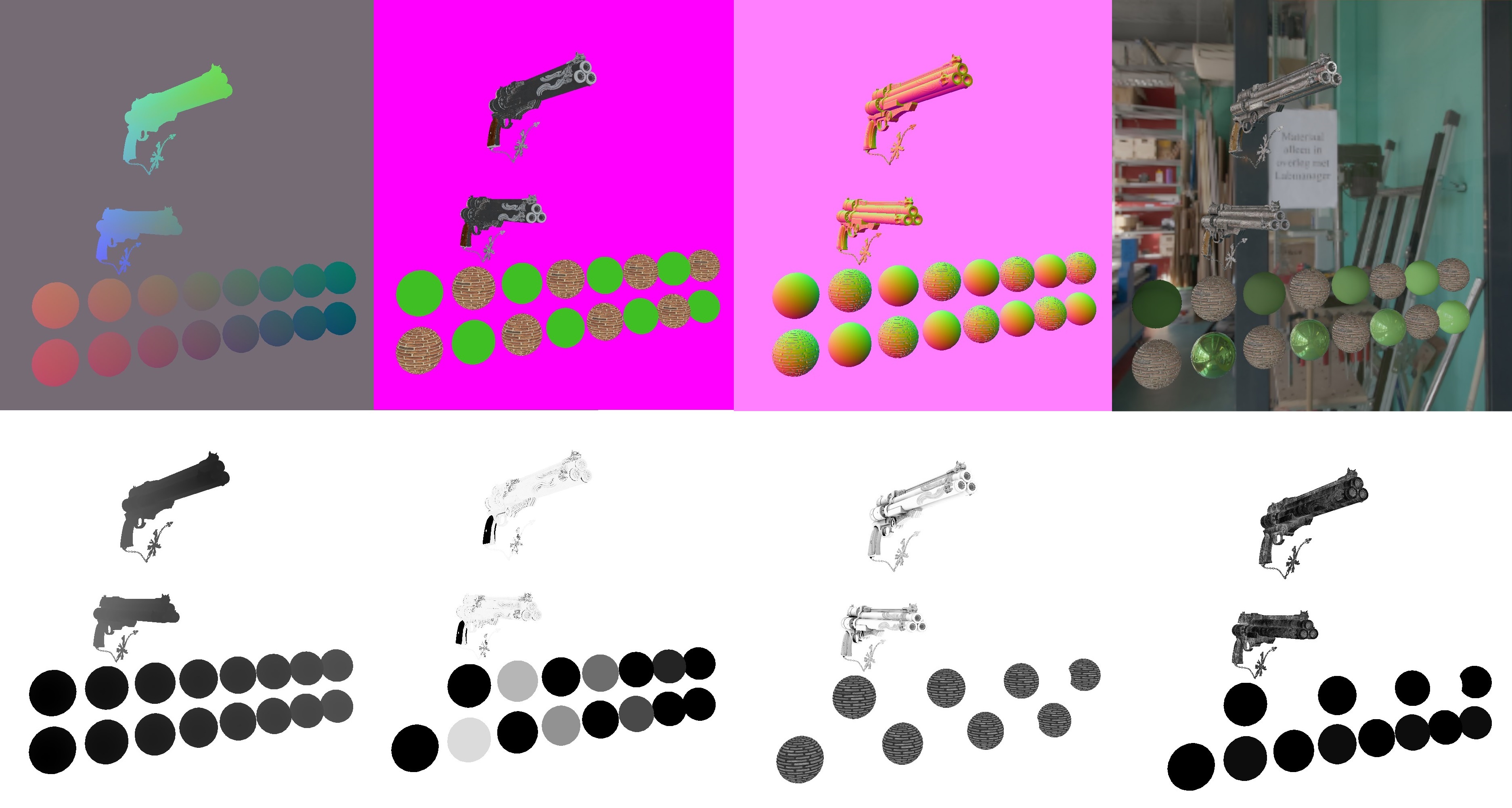 GBUFFER (obere links nach unten rechts): Position, Albedo, Normal, endgültiges Bild, Tiefe, Metallic, AO, Rauheit
