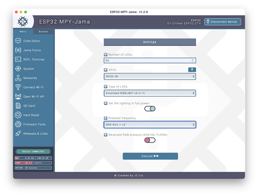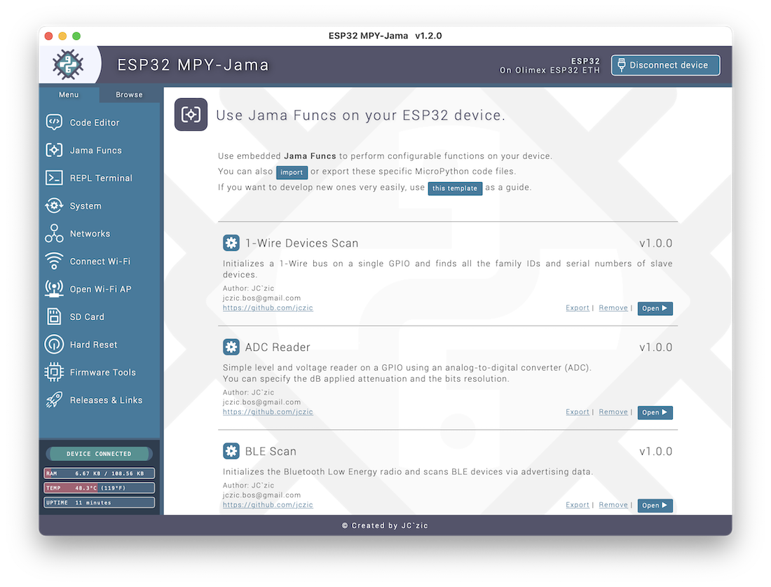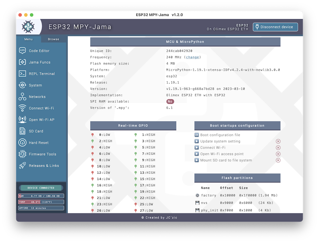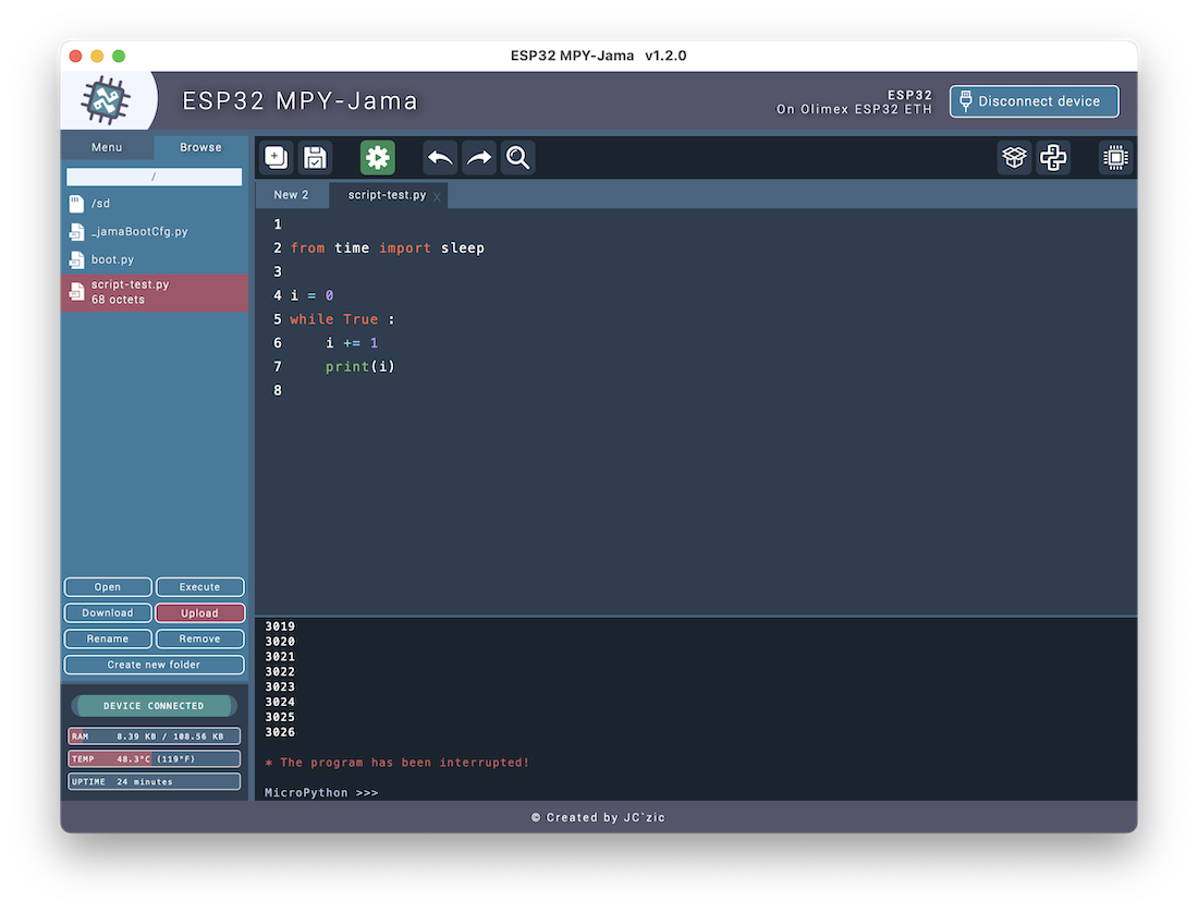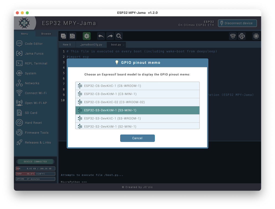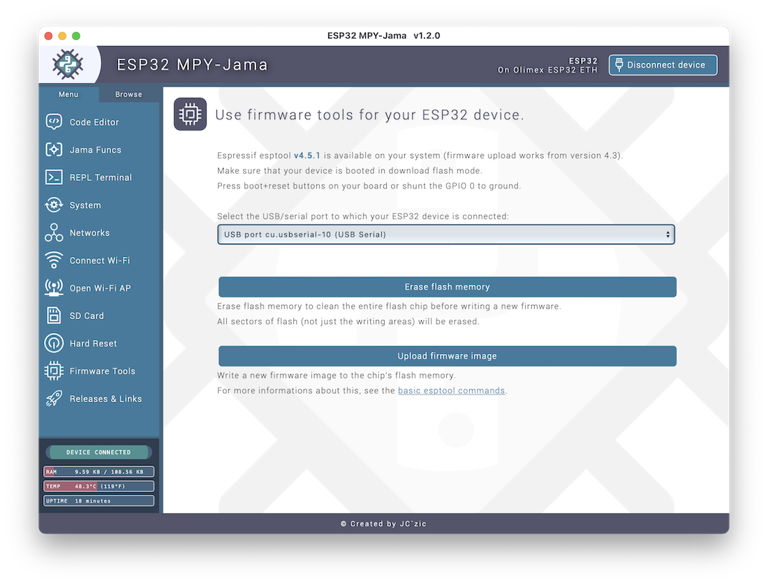 Willkommen bei ESP32 MPY-JAMA , einem leistungsstarken und vielseitigen plattformübergreifenden Tool, das Ihre Entwicklung mit ESP32 Microcontrollern und Micropython von Espressif vereinfacht.