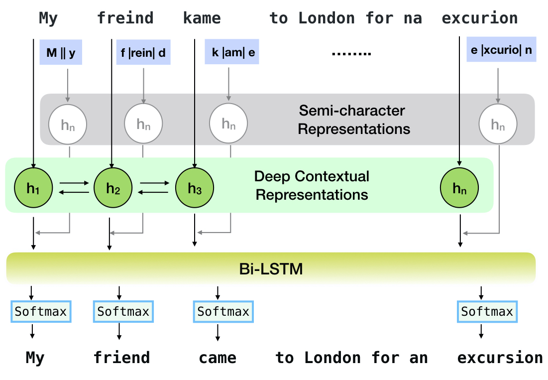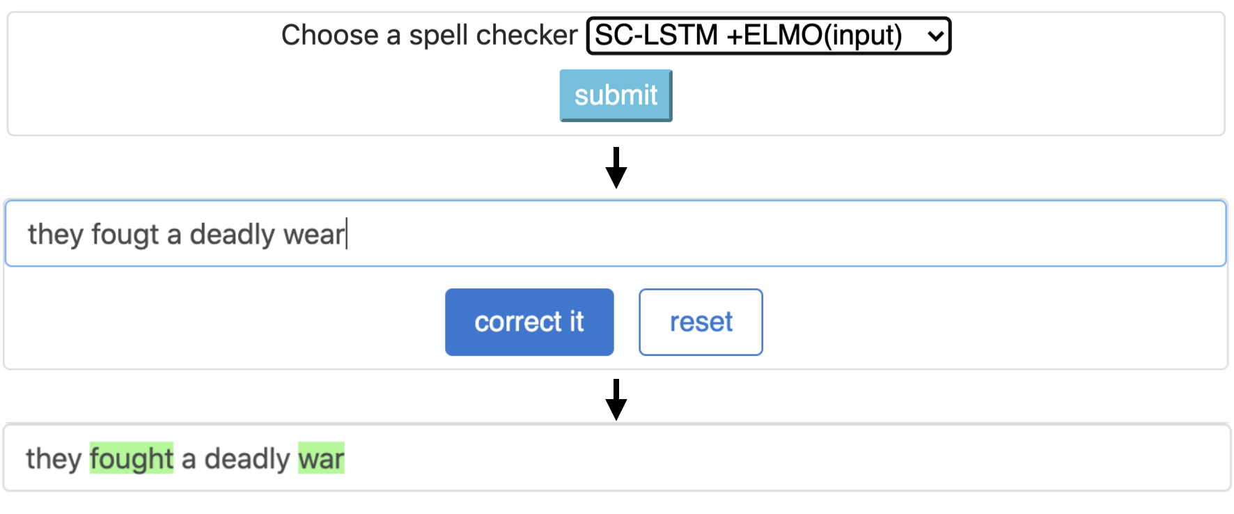 pip install -e ".[flask]"CUDA_VISIBLE_DEVICES=0 python app.py (auf GPU) oder python app.py (auf CPU) ausführen. Dieses Toolkit bietet drei Arten von NOising -Strategien (identifiziert aus der vorhandenen Literatur), um synthetische parallele Trainingsdaten zu generieren, um neuronale Modelle für die Zauberkorrektur zu schulen. Zu den Strategien gehören ein einfacher Suchbasis, der laute Rechtschreibersatz ( en-word-replacement-noise ), eine Charakterpegel-Geräuschinduktion wie Tausch/Deletieren/Ersetzen/Ersetzen von Zeichen ( en-char-replacement-noise ) und ein Verwirrungsmatrix-basierter probilistischer Charakterersatz von Mustern en-probchar-replacement-noise -Nr. Weitere Informationen zu diesen Ansätzen finden Sie in unserem Papier.