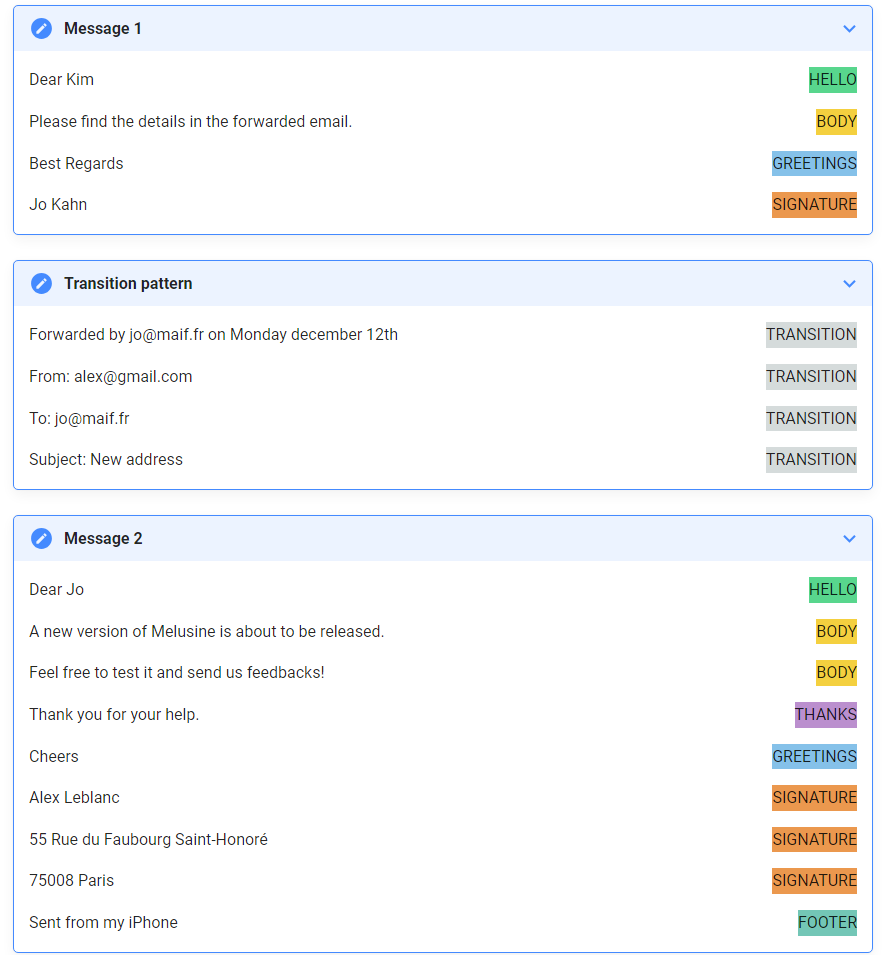Im folgenden Beispiel ist eine E -Mail in zwei unterschiedliche Nachrichten unterteilt, die durch ein Übergangsmuster getrennt sind. Jede Nachricht wird dann Zeile für Zeile markiert. Diese E -Mail -Segmentierung kann später genutzt werden, um die Leistung von Modellen für maschinelles Lernen zu verbessern.