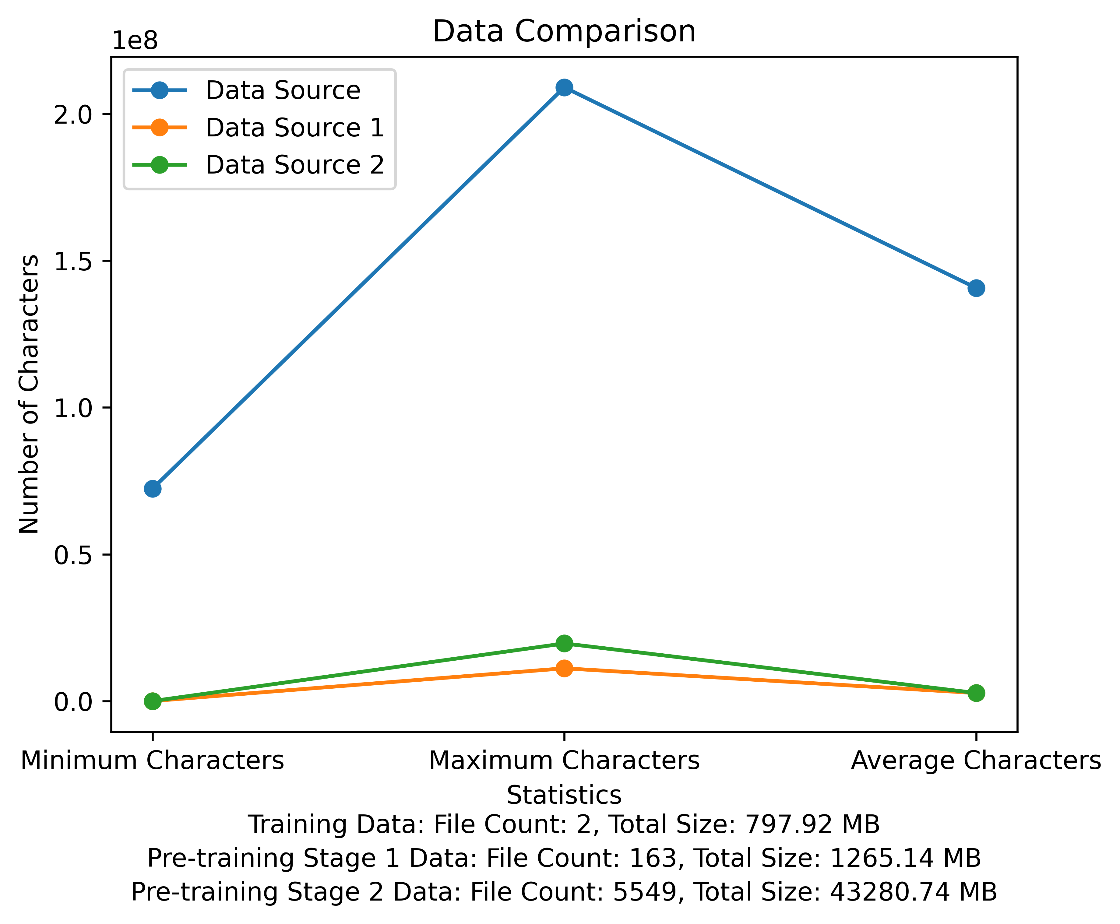 Die Wortschatzliste und das Datenvergleichsdiagramm der Vorausbildungsphase. Die Abbildung zeigt die Anzahl der Dateien und Gesamtdateigrößen jeder Datenquelle und vergleicht die minimalen und maximalen Zeichen und die durchschnittliche Anzahl der Zeichen in jeder Datei: