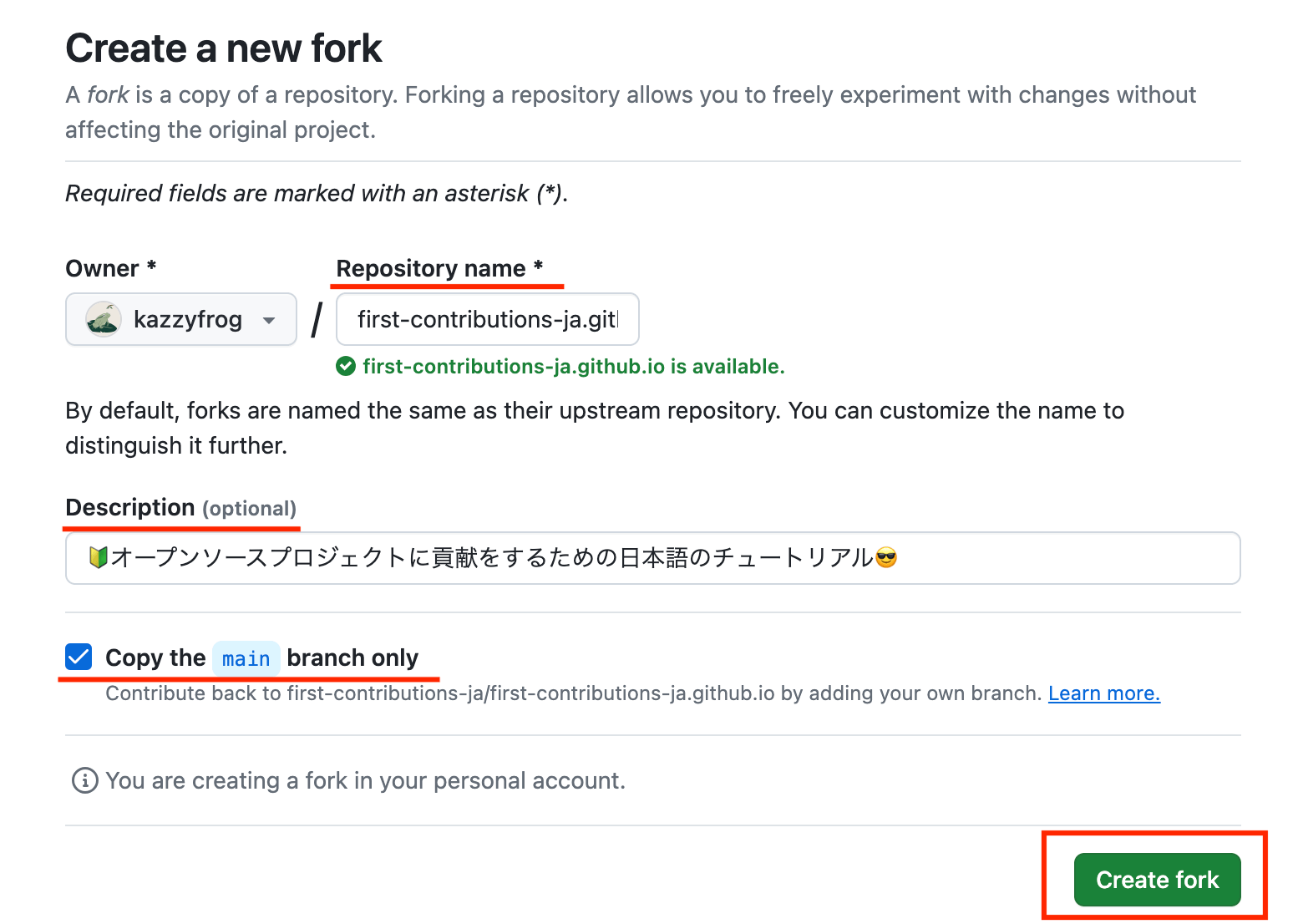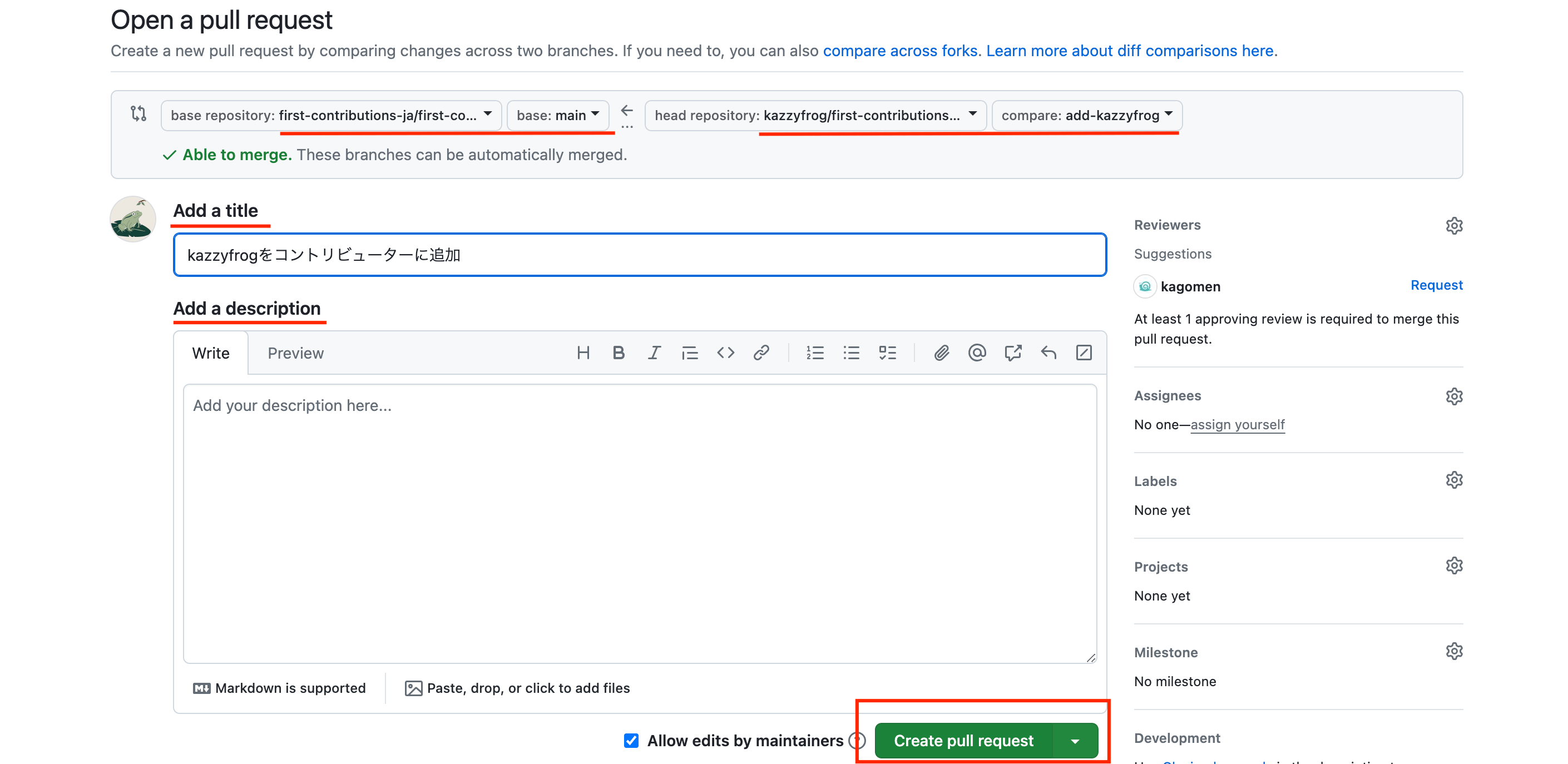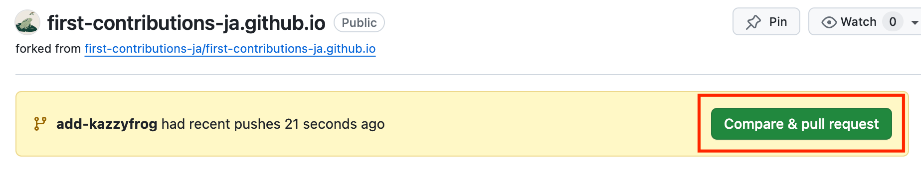 https://github.com/あなたのアカウント/first-contributions-ja.github.io ). - Klicken Sie oben auf die Schaltfläche "Vergleich & Pull -Anfrage".