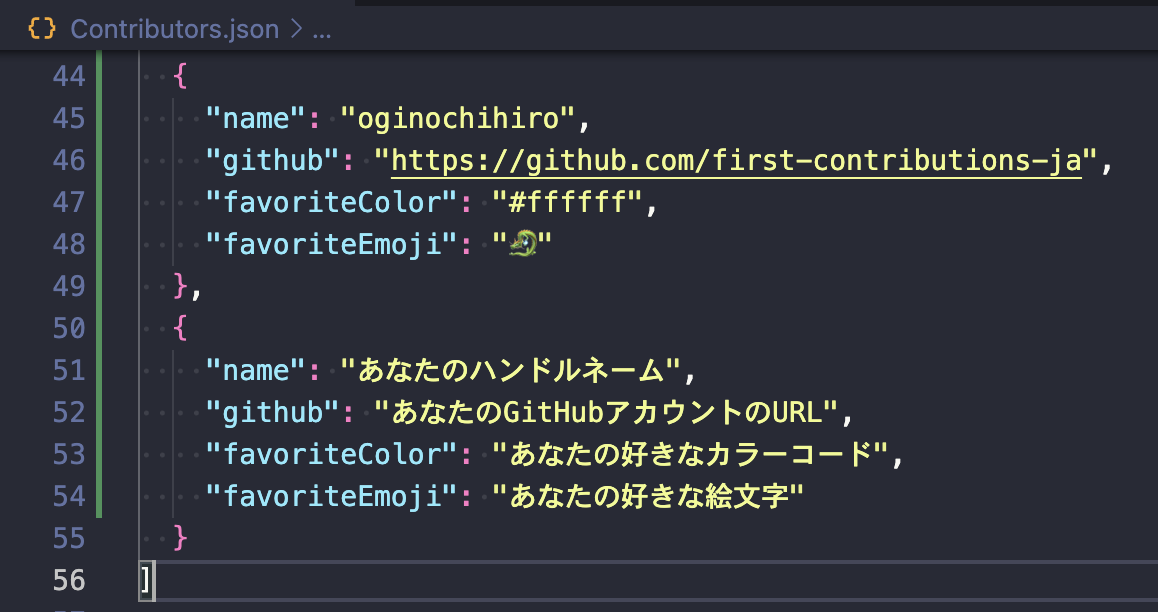 - Kopieren und fügen Sie den folgenden Code in die "Ende der Liste" in Ihre Datei mit den Mitwirkenden.json ein: