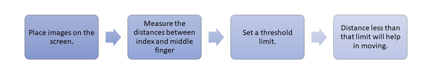 Dies ist eine virtuelle Bildschleppanwendung. Benutzer können Fotos praktisch über den Bildschirm schieben. Der Abstand zwischen dem Index und dem Mittelfinger bestimmt die Bewegung. Kleinere Entfernungen zeigen Klick und Bewegung an, während größere Entfernungen nur Handbewegungen anzeigen.