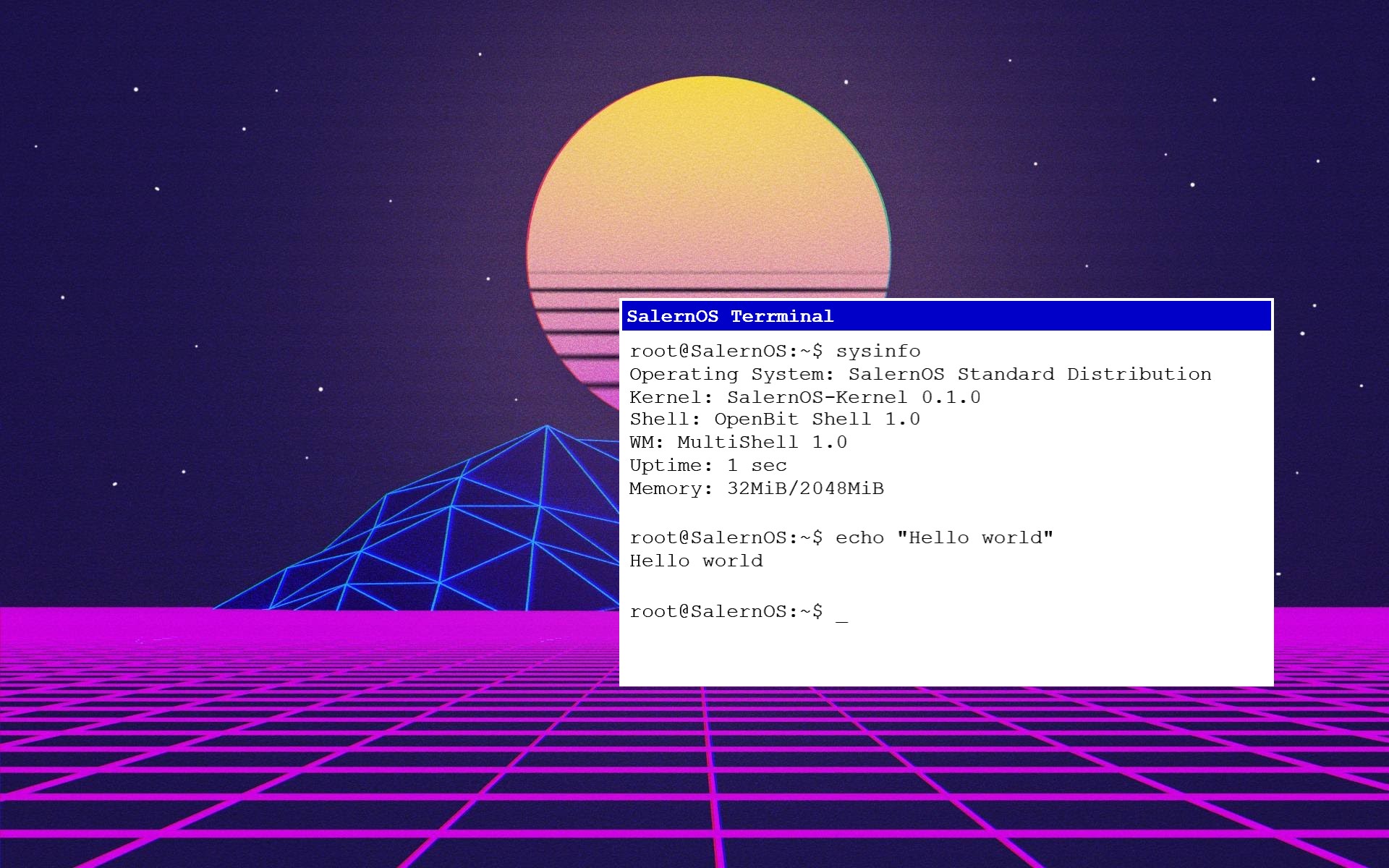 Salernos ist ein kleines, arbeitsbeteiliges Ein-Mann-Projekt zum Erlernen des Betriebssystementwickels, indem sie eine von Grund auf neu erstellen.