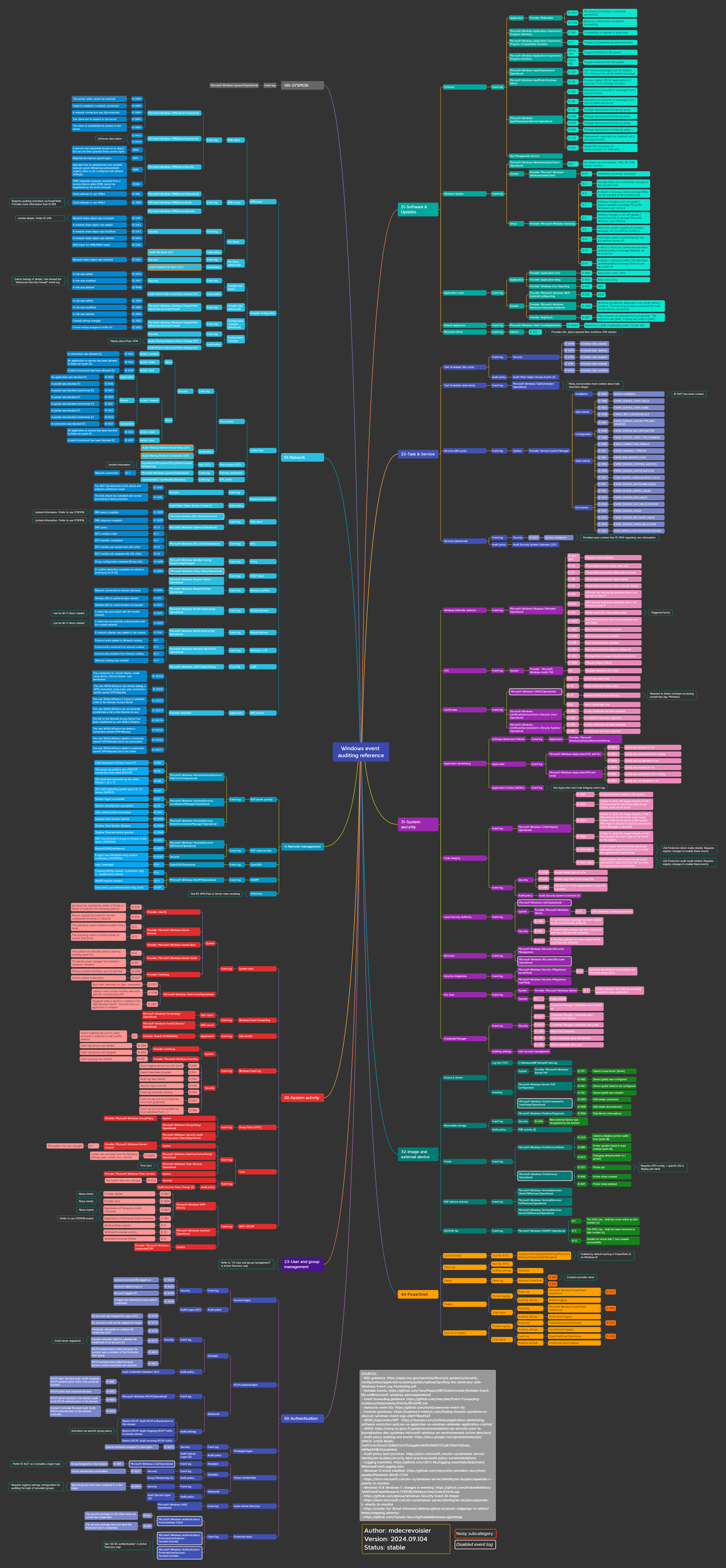 Diese Karte bietet einen Überblick über die nativen Ereignisprotokolle, die in Windows -Betriebssystemen geliefert werden. Sie werden in verschiedene Kategorien eingeteilt (Netzwerk, Sicherheit, Anwendung, ...) und deren zugehörige Prüfungseinstellungen.