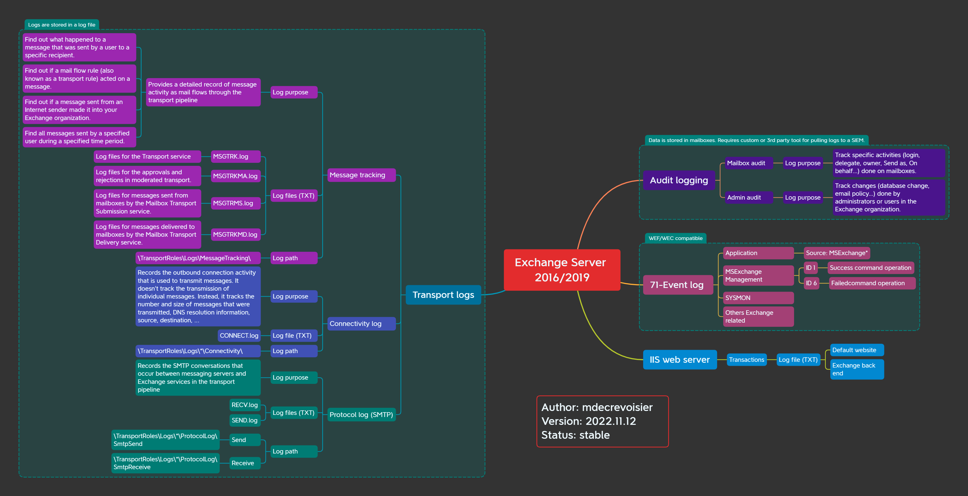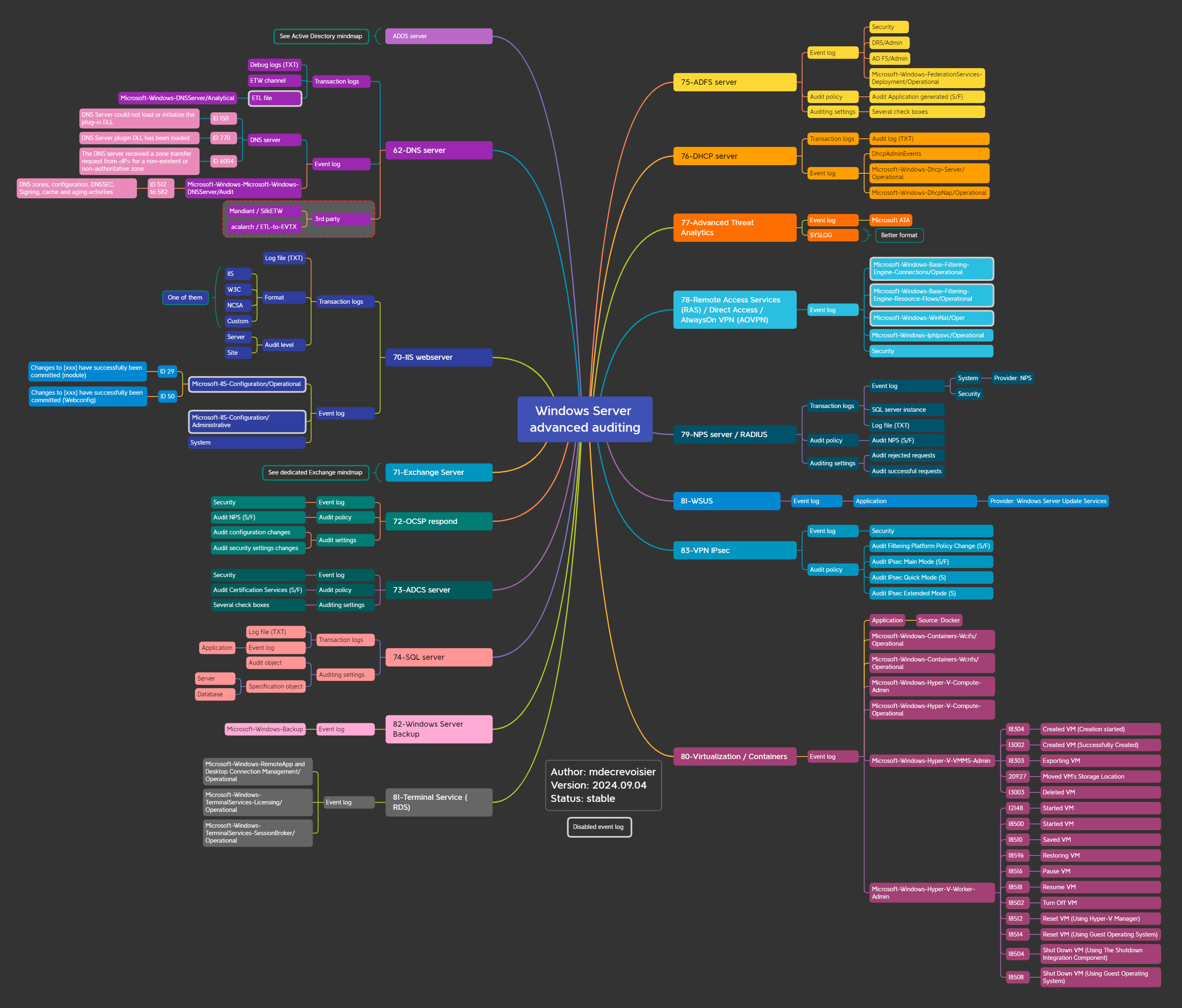Diese Karte bietet einen Überblick über die verschiedenen Ereignisprotokolle und Prüfungskapazitäten, die von Windows Server -Rollen bereitgestellt werden (ADCs, DHCP, DNS, OCSP, IIS, NPS, ADFS, MSSQL, RDS ...).