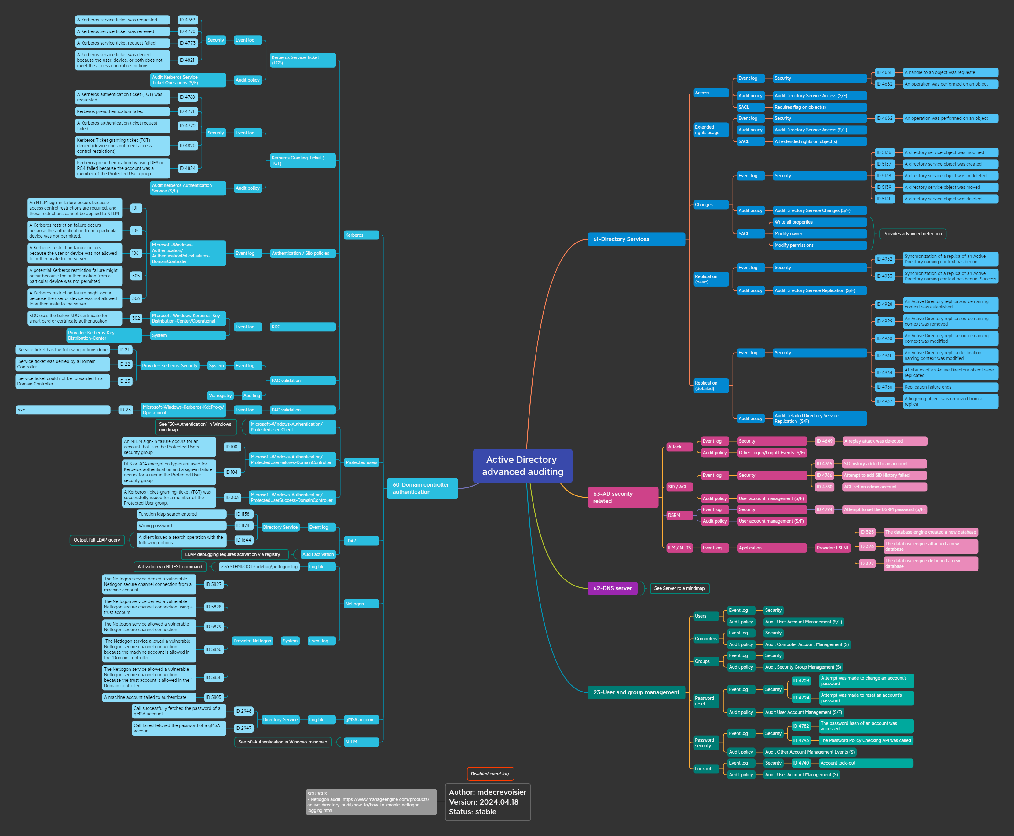 Diese Karte bietet einen Überblick über die verschiedenen Ereignisprotokolle und Prüfungskapazitäten von Active Directory (Adds).