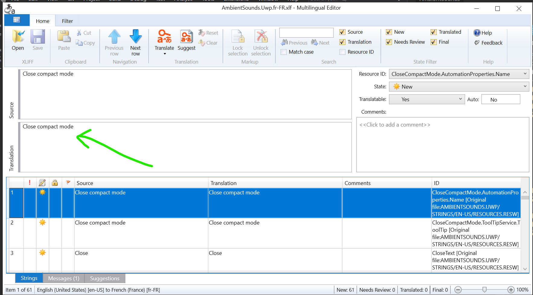 AmbientSounds.Uwp ..xlf -Dateien im Ordner MultilingualResources erstellt.Humanizer.Core Nuget -Paket für eine neue SpracheImproving an existing language .MultilingualResources den .xlf der Sprache, die Sie übersetzen möchten.<target> -Knoten. Ändern Sie dann die state Eigenschaft in translated .
