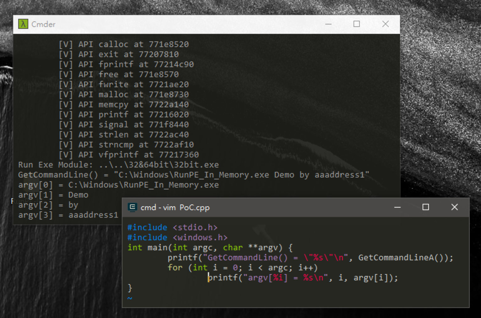 Verwendung: peLoader("path/to/exe/file", "arg1, arg2, arg3, ...")