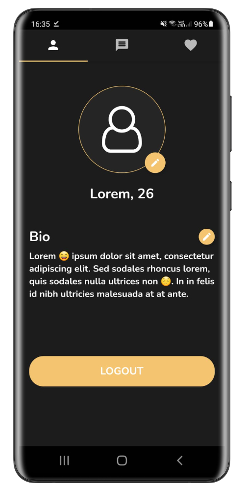 Profilbildschirm: Bild ändern, Biografie ändern, Abmelden abmelden