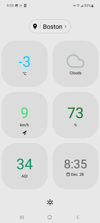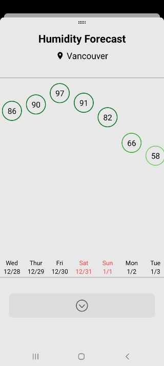 Zu Beginn fragt die App nach dem aktuellen Standort des Benutzers. Wenn die App gewährt wird, holt die App Wetterdaten für diesen Standort ab. Benutzer können auf jede STAT auf Tippen auf entsprechende Wettervorhersagen auf Tippen.