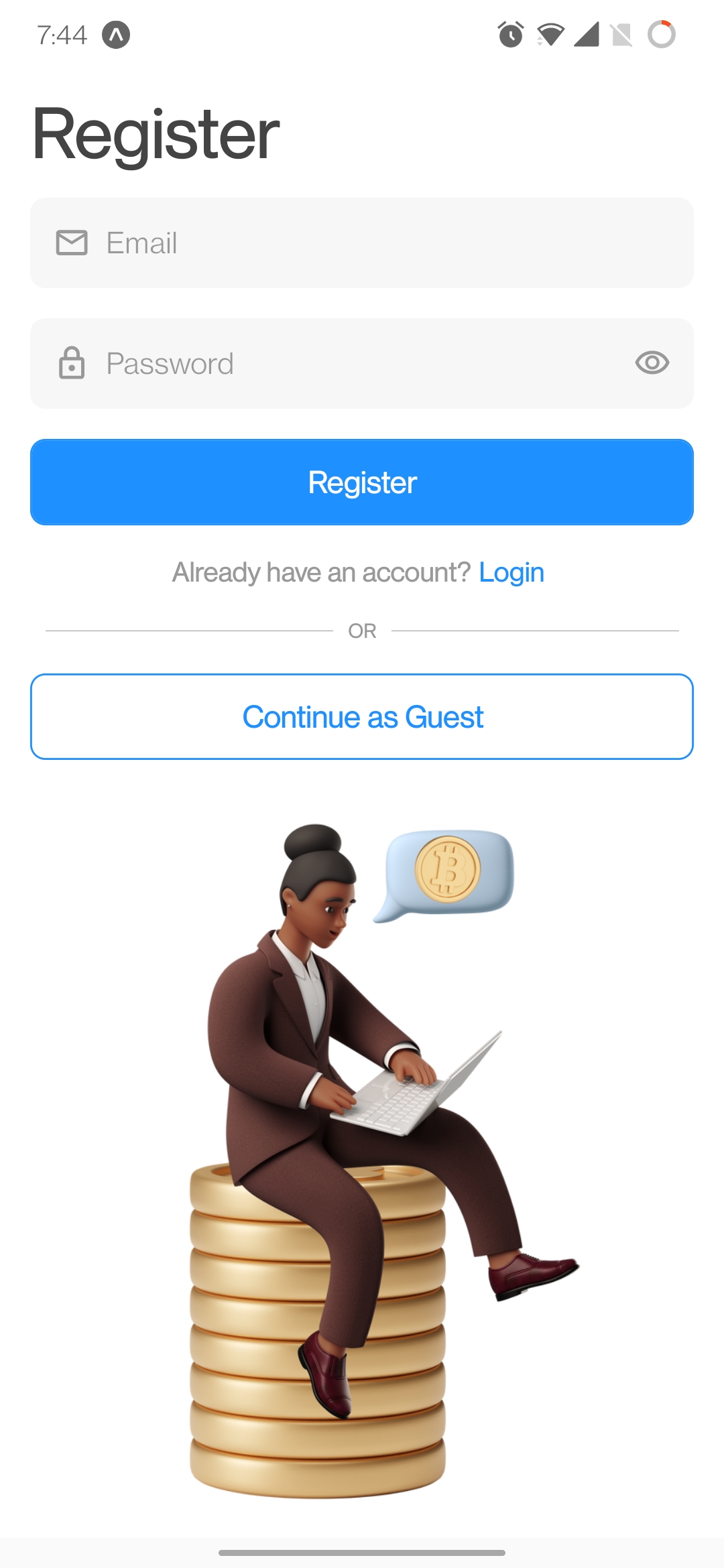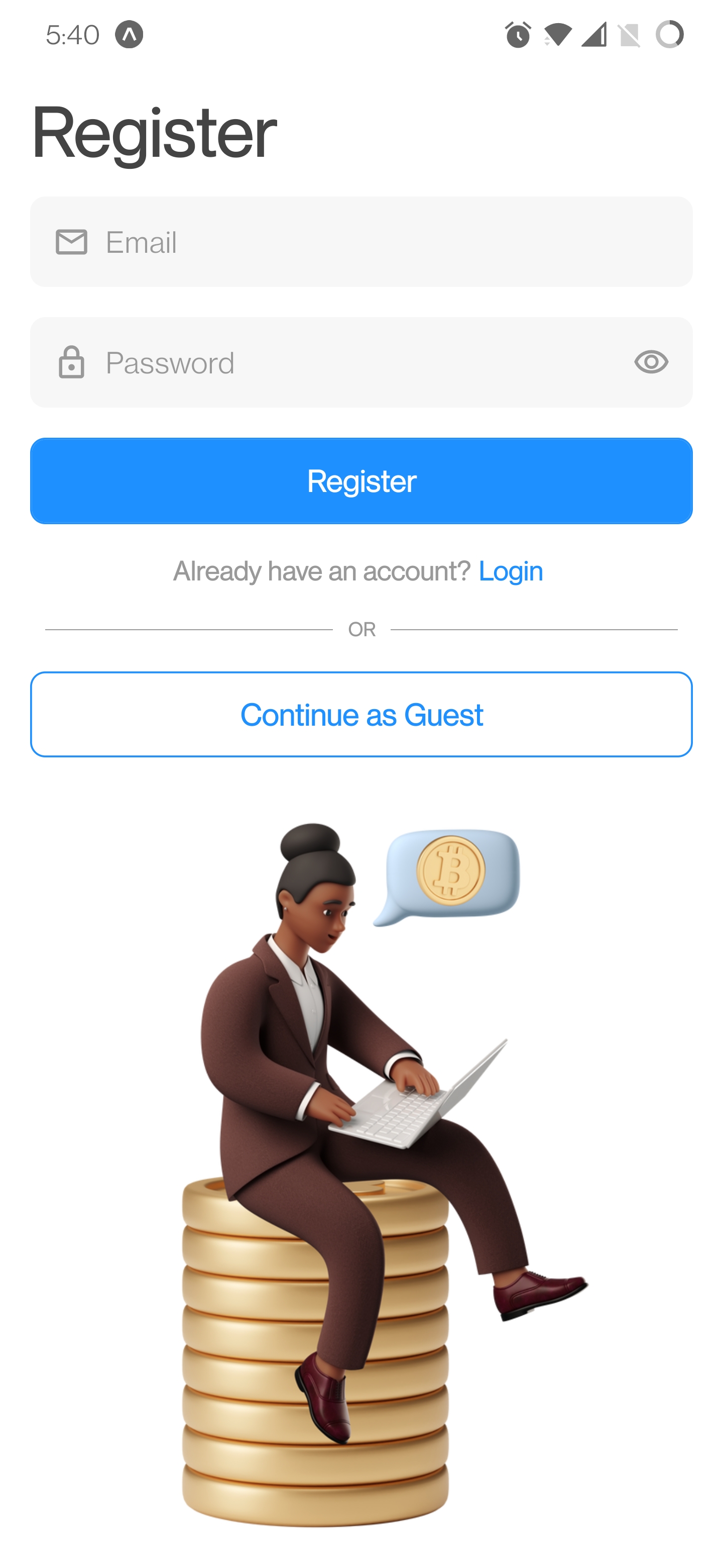 Login/Register -Bildschirm