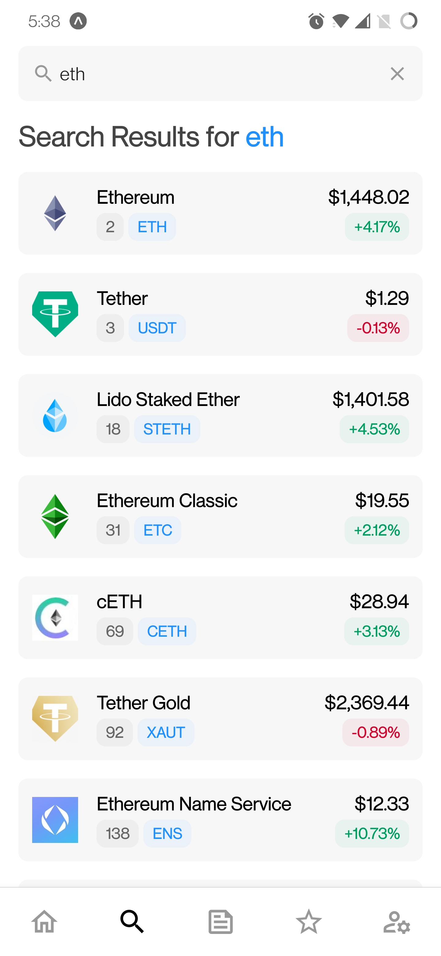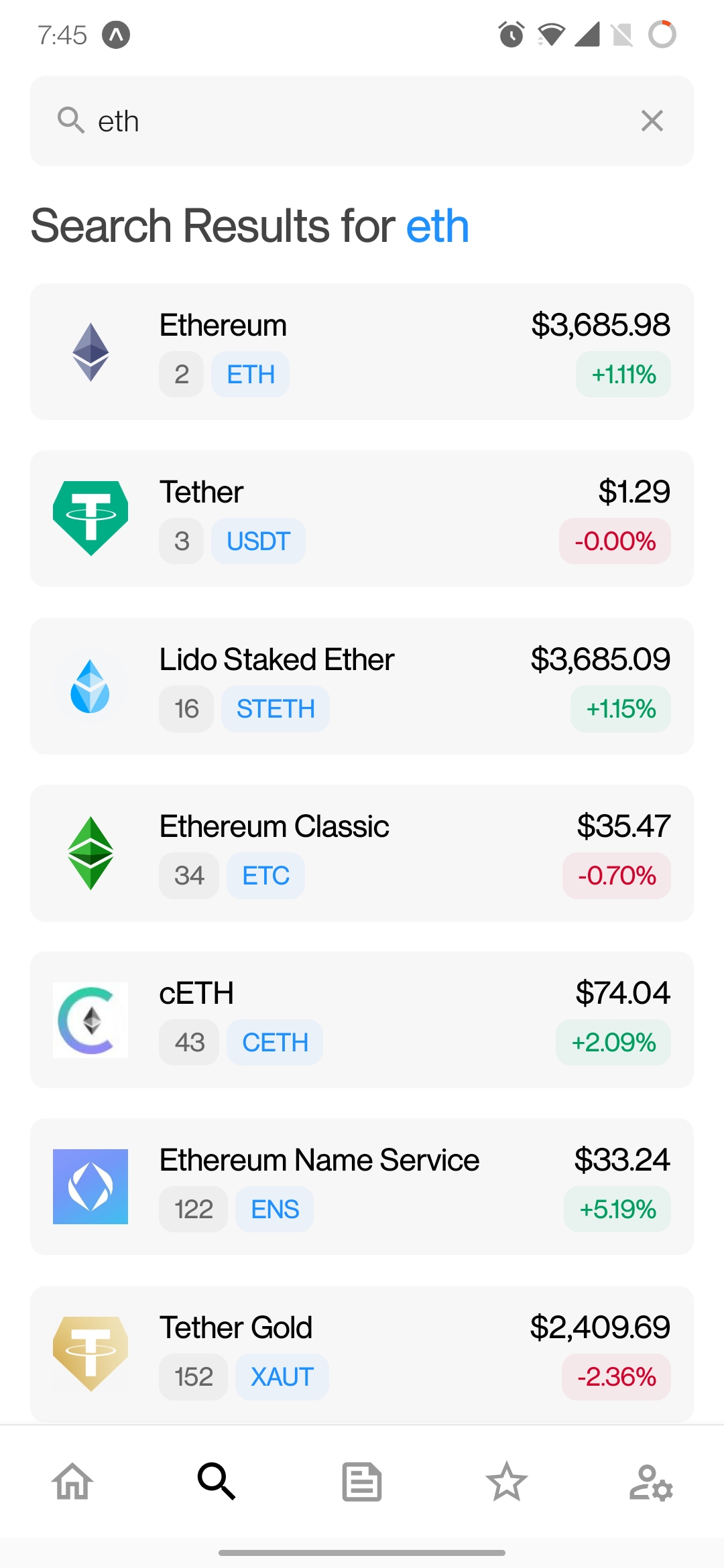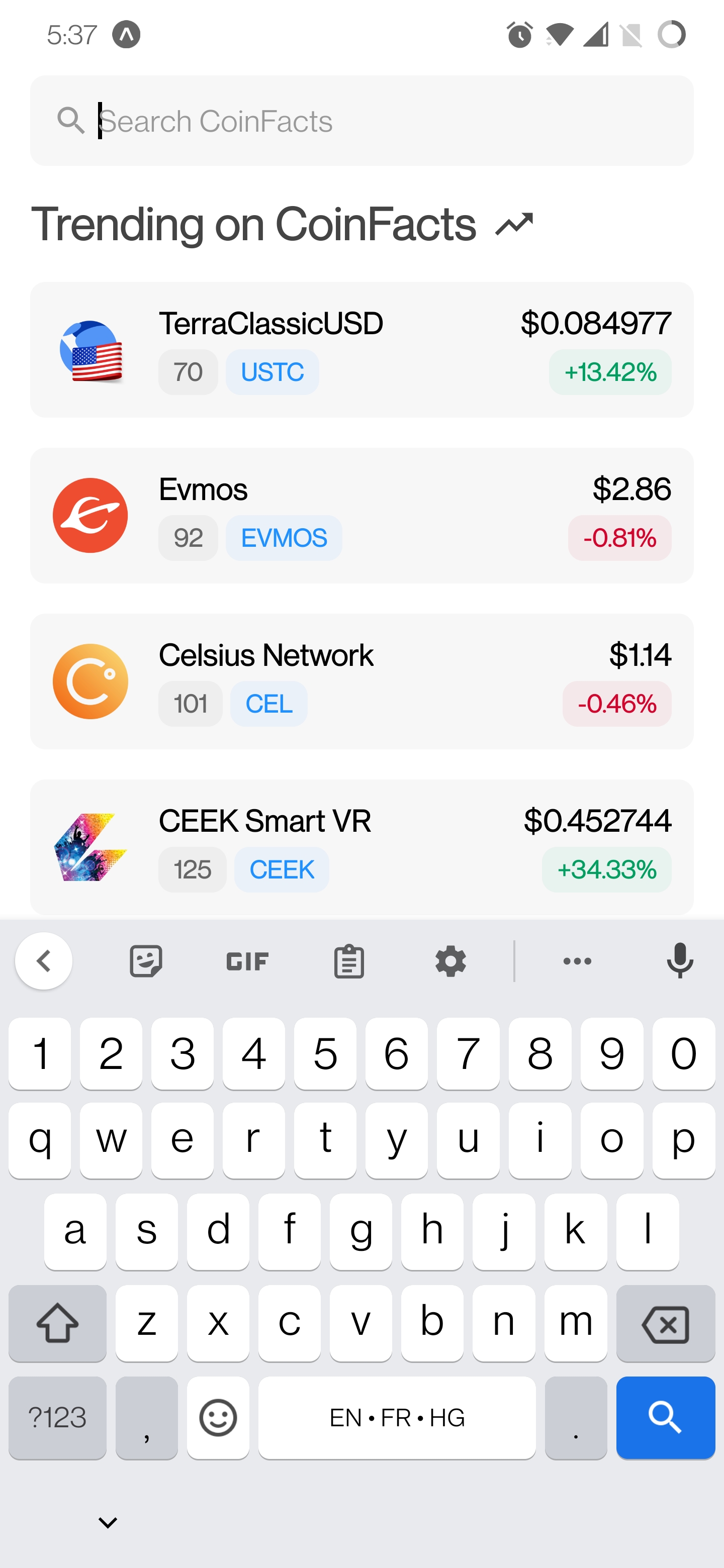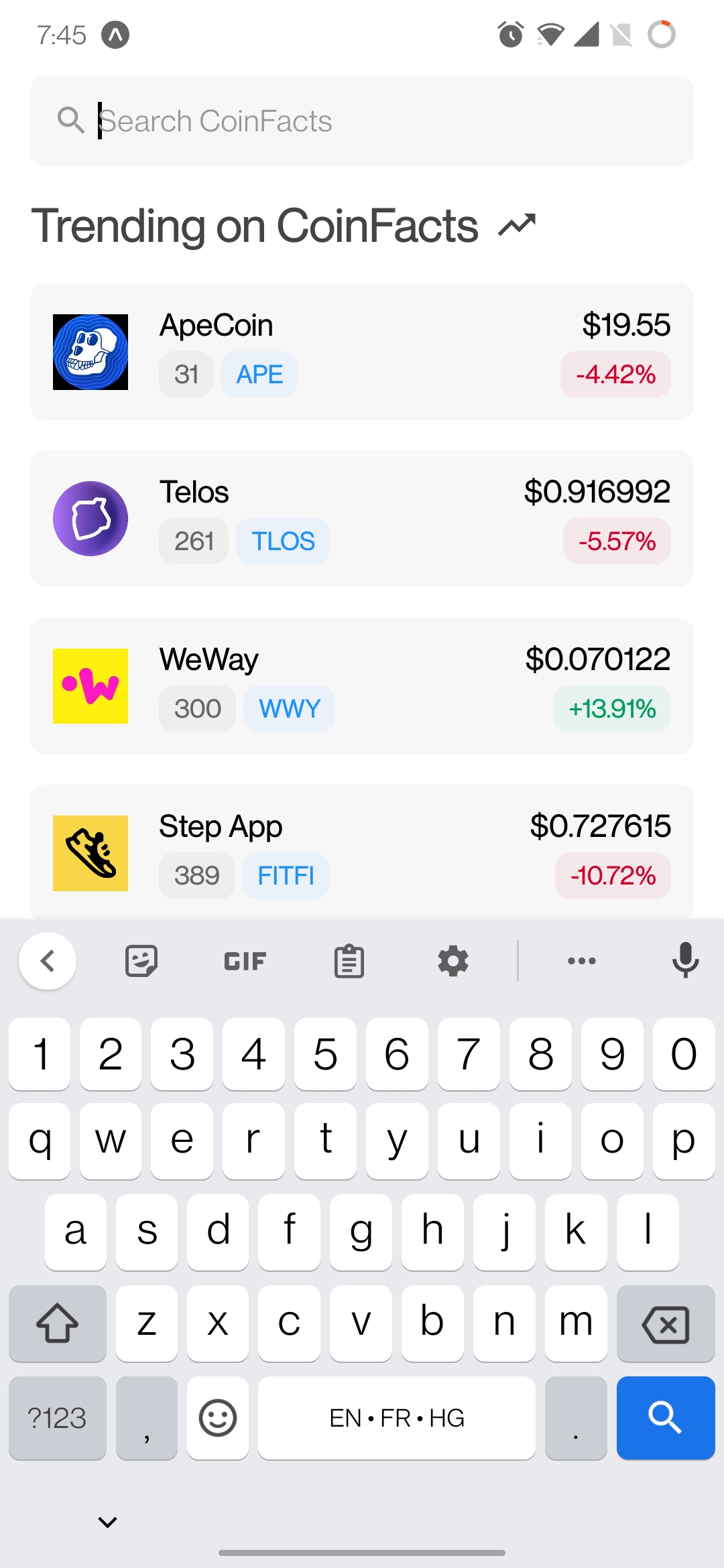 - Beim Navigieren zu diesem Bildschirm wird dem Benutzer die Top 7 Trendmünzen angezeigt.