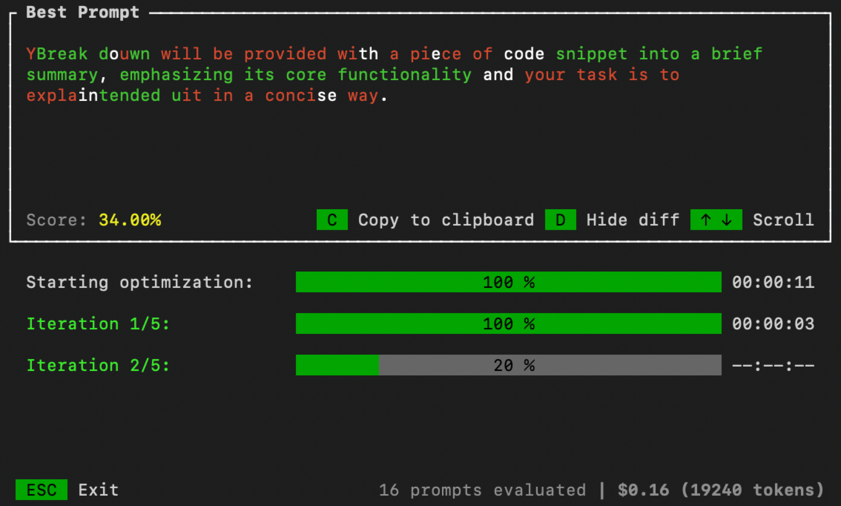 --improve " Summaries need to include less code references and be more high-level. "Sobald Sie fertig sind, öffnet sich eine Benutzeroberfläche in Ihrem Terminal zur Überwachung des Optimierungsprozesses: