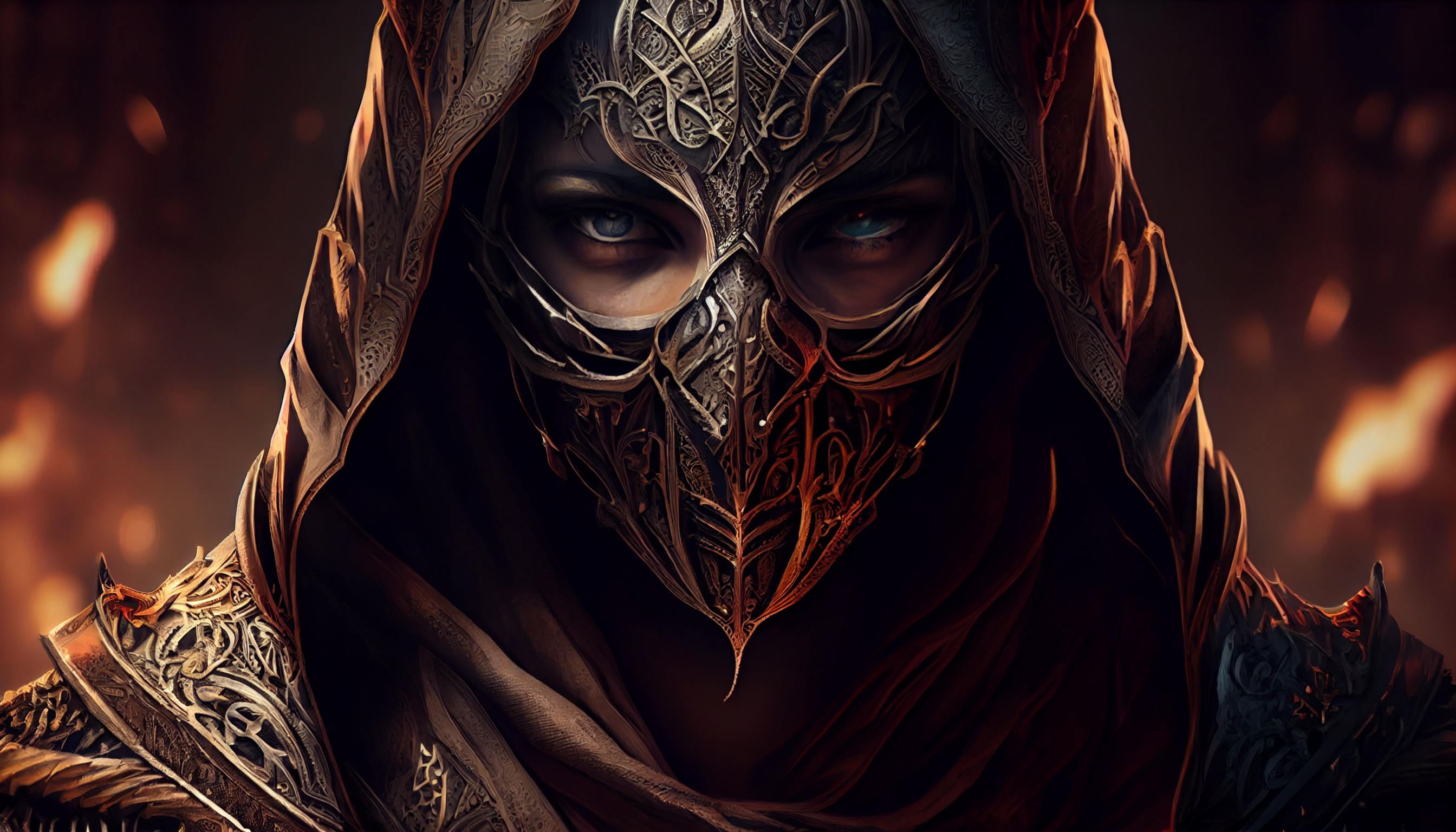 Elven assassin with a masked face and intricate runes. Highly detailed photorealism showcases the intricate details of the mask and runic markings. Focused on the assassin's face, with a blurred background. The lighting is a blend of candlelight and twilight, adding a sense of mystery to the character. The style is a mix of ancient and fantasy. Resolution: --ar 16:9 --s 1000 --q 2 --upbeta --v 4