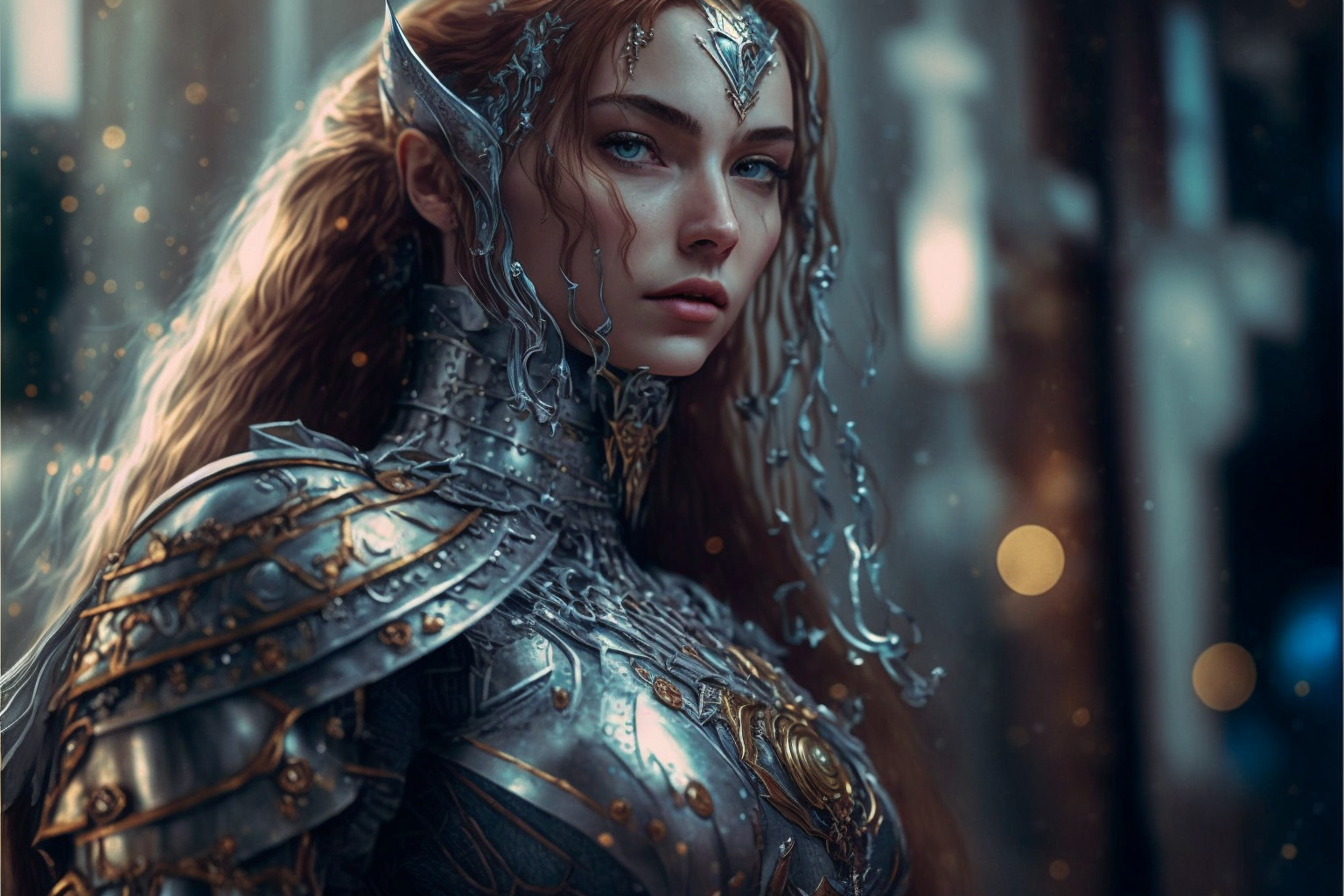 An elven warrior girl wielding a sword, dressed in armor made of intricate metals and fabrics. She stands against a futuristic background with high-tech elements, rendered with the latest technologies. Focused, blurred background, full-body::5 soft light::1 high quality photo::1 --v 4 --ar 3:2 --s 1000 --q 5
