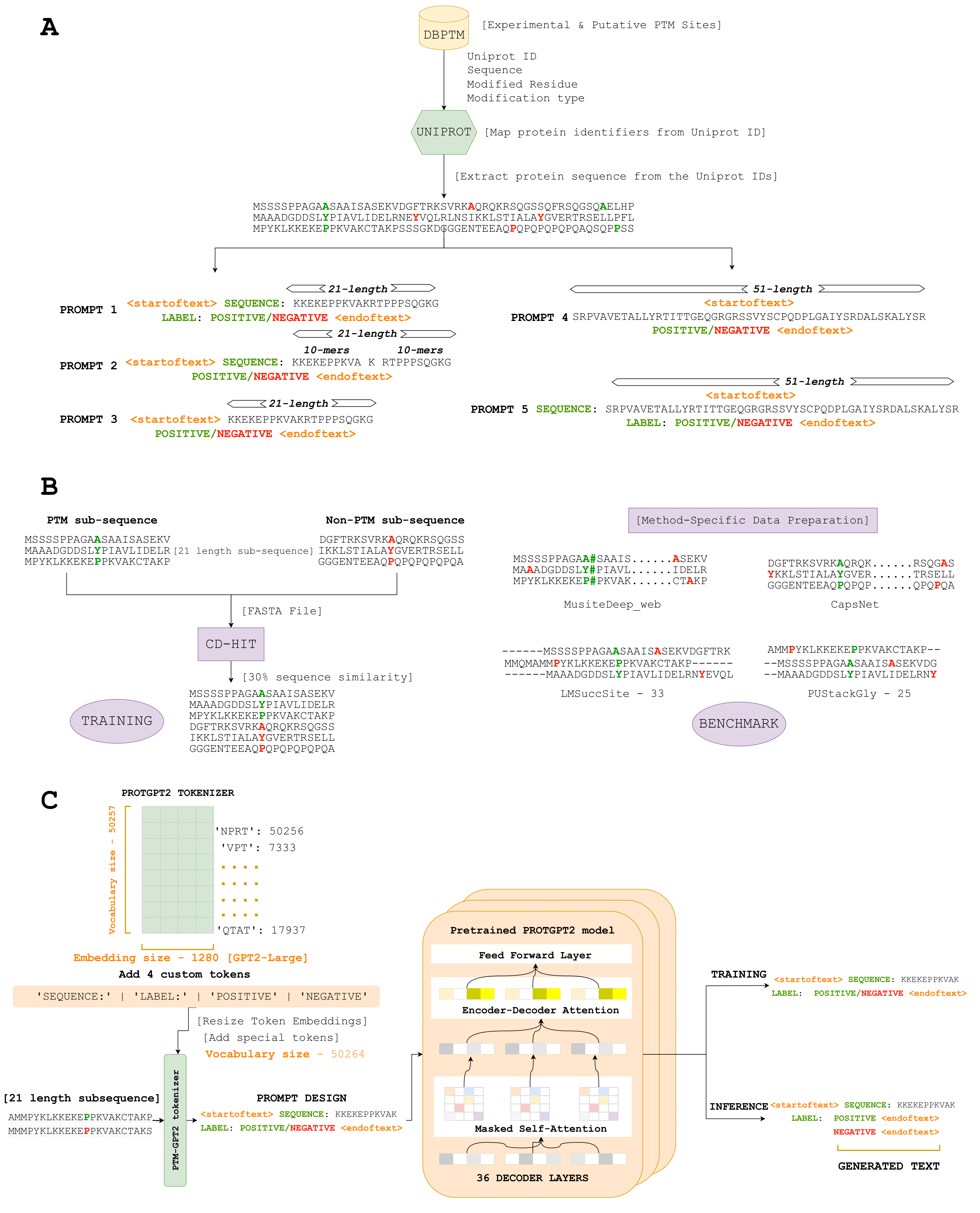 Hier führen wir PTMGPT2 ein, eine Reihe von Modellen, die Token erzeugen können, die modifizierte Proteinsequenzen bedeuten, die für die Identifizierung von PTM -Stellen entscheidend sind. Im Kern dieser Plattform steht ProtGPT2, ein autoregressives Transformatormodell. Wir haben ProGGPT2 angepasst, indem wir es als vorgebildetes Modell verwendet und es für die Spe-Cific-Aufgabe, Klassifizierungsbezeichnungen für einen bestimmten PTM-Typ zu generieren, weiter abgestimmt. Eindeutig verwendet PTMGPT2 eine Nur-Decoder-Architektur, wodurch die Notwendigkeit eines aufgabenspezifischen Klassifizierungskopfs während des Trainings beseitigt wird. Stattdessen fungiert die endgültige Schicht des Decoders als Projektion zurück zum Wortschatz und erzeugt das nächste mögliche Token, das auf den gelernten Mustern unter Token in der Eingabeaufforderung basiert.