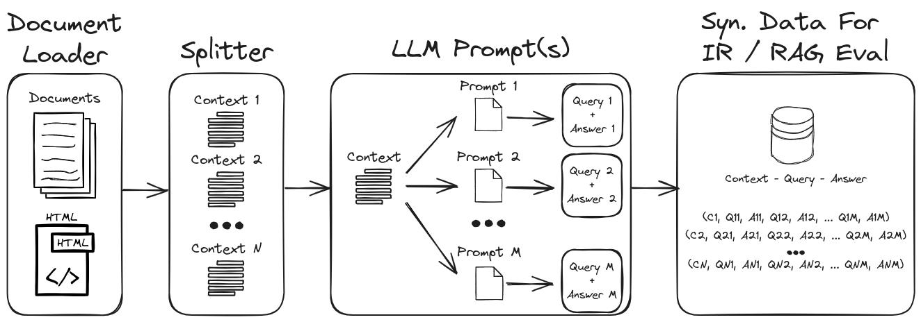 Beim Erstellen eines IR- oder Lappensystems ist ein Datensatz mit Kontext, Abfragen und Antworten für die Bewertung der Systemleistung von entscheidender Bedeutung. Menschenanbieter-Datensätze bieten hervorragende Grundwahrheiten, können aber teuer und herausfordernd sein, um zu erhalten. Daher sind synthetische Datensätze, die mit LLMs erzeugt werden, eine attraktive Lösung und Ergänzung.