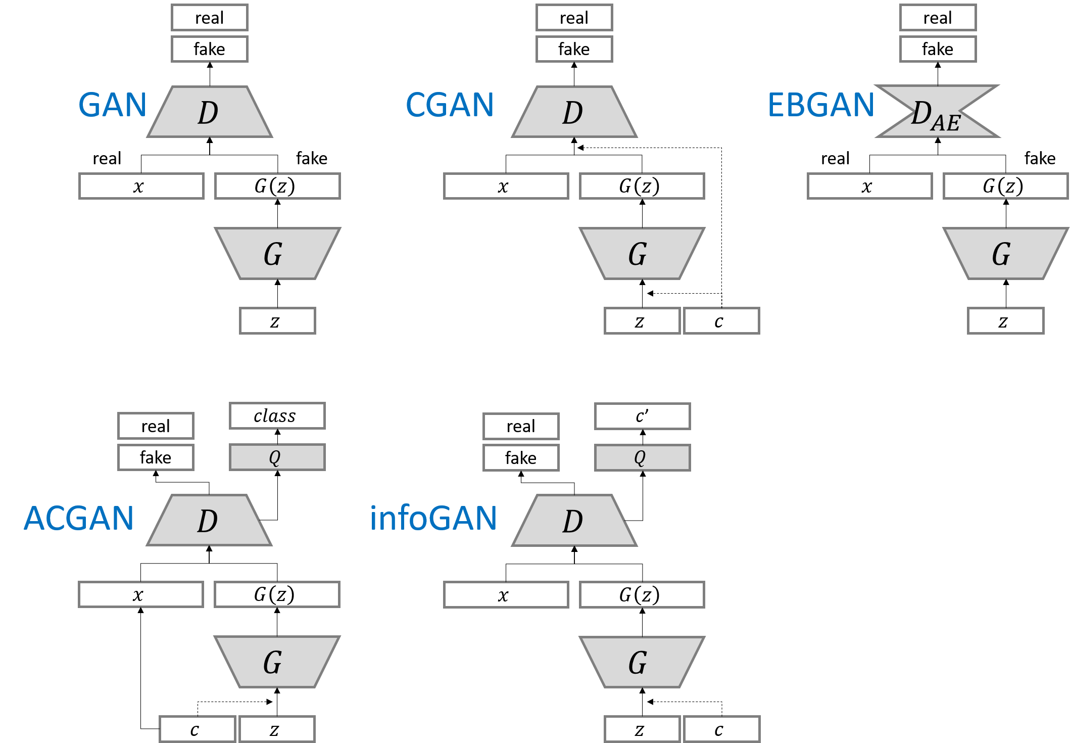 Für einen fairen Vergleich von Kernideen in allen GAN -Varianten werden alle Implementierungen für die Netzwerkarchitektur außer Ebgan gehalten und begonnen. Für Ebgan/Beginn wird eine geringe Modifikation vorgenommen, da diejenigen, die den Auto-Coder-Strucutre für Diskriminator anwenden. Aber ich habe versucht, die Kapazität des Vervibgers zu halten.