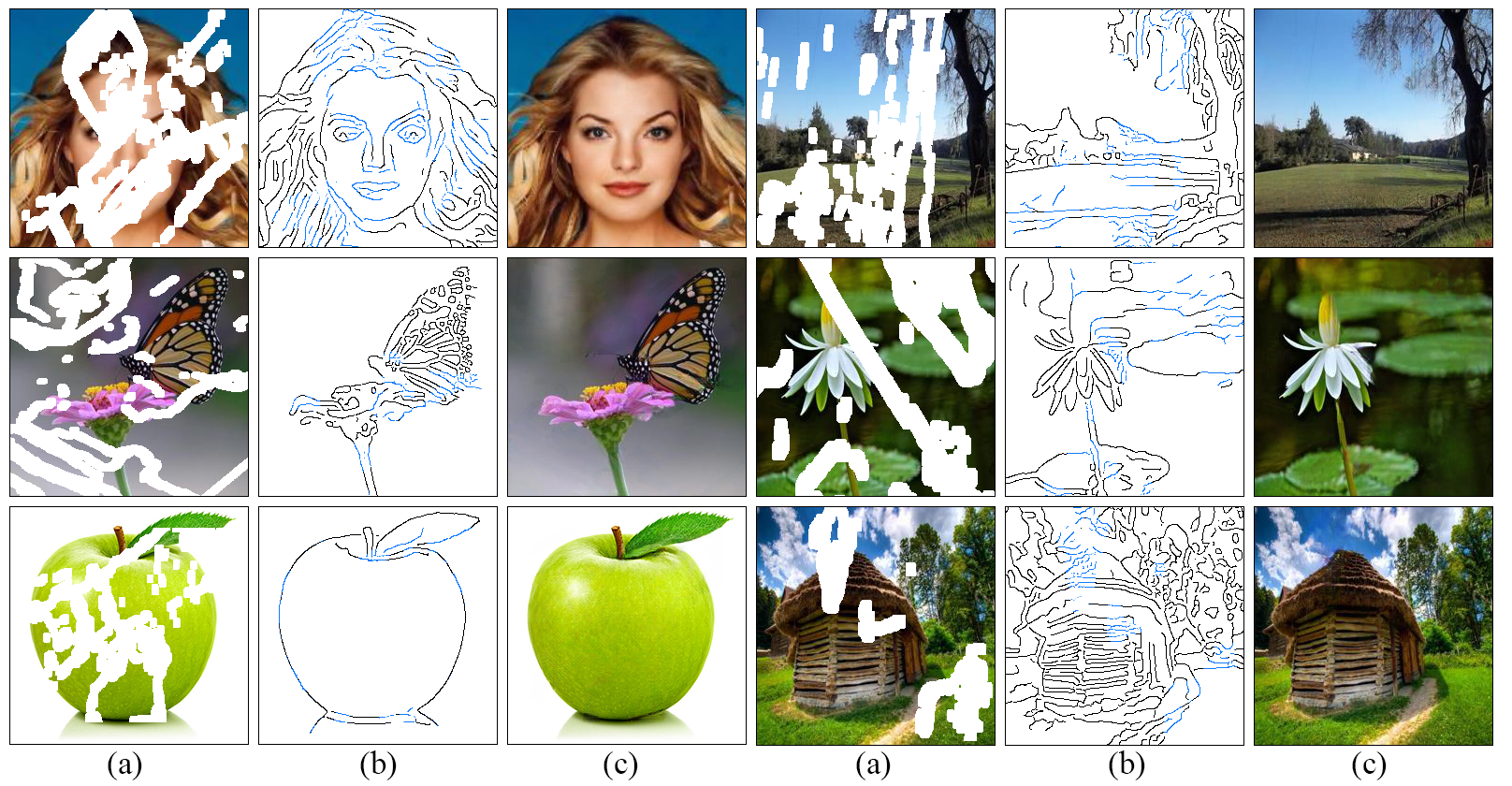 Wir entwickeln einen neuen Ansatz für Image -Inpainting, bei dem gefüllte Regionen besser reproduziert werden und feine Details zeigen, die von unserem Verständnis für die Arbeit von Künstlern inspiriert sind: Zeilen zuerst, Farbe als nächstes . Wir schlagen ein zweistufiges kontroverses Modell EdgeConnect vor, das einen Kantengenerator umfasst, gefolgt von einem Bildabschlussnetzwerk. Der Edge -Generator halluziniert die Kanten der fehlenden Region (sowohl regulär als auch unregelmäßig) des Bildes, und das Bildvervollständigungsnetzwerk füllt die fehlenden Regionen mit halluzinierten Kanten a priori aus. Eine detaillierte Beschreibung des Systems finden Sie in unserem Artikel.